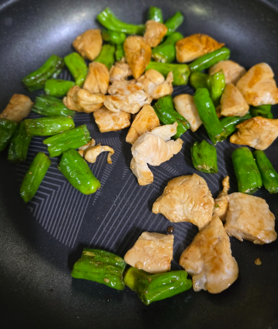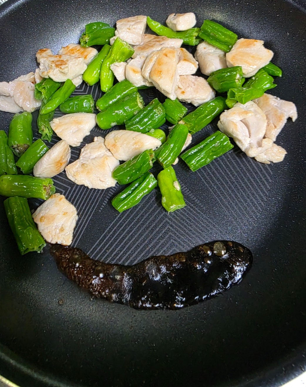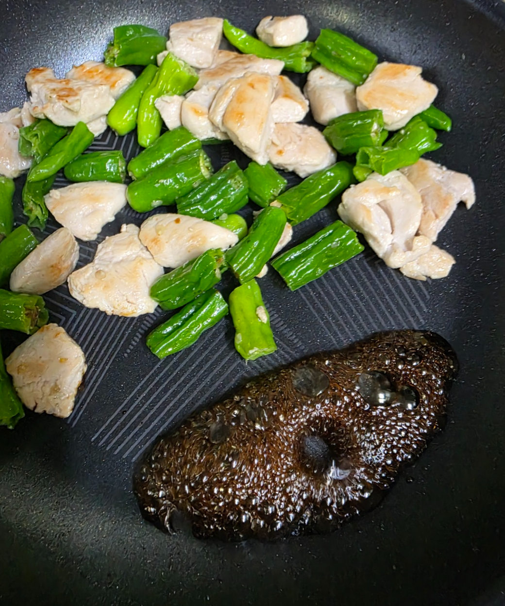 썰어둔 꽈리고추를 넣어줍니다. 꽈리고추도 살짝 익도록 같이 볶아주세요.