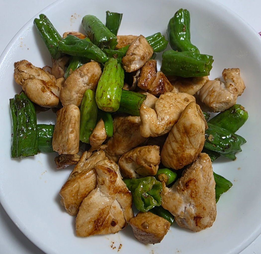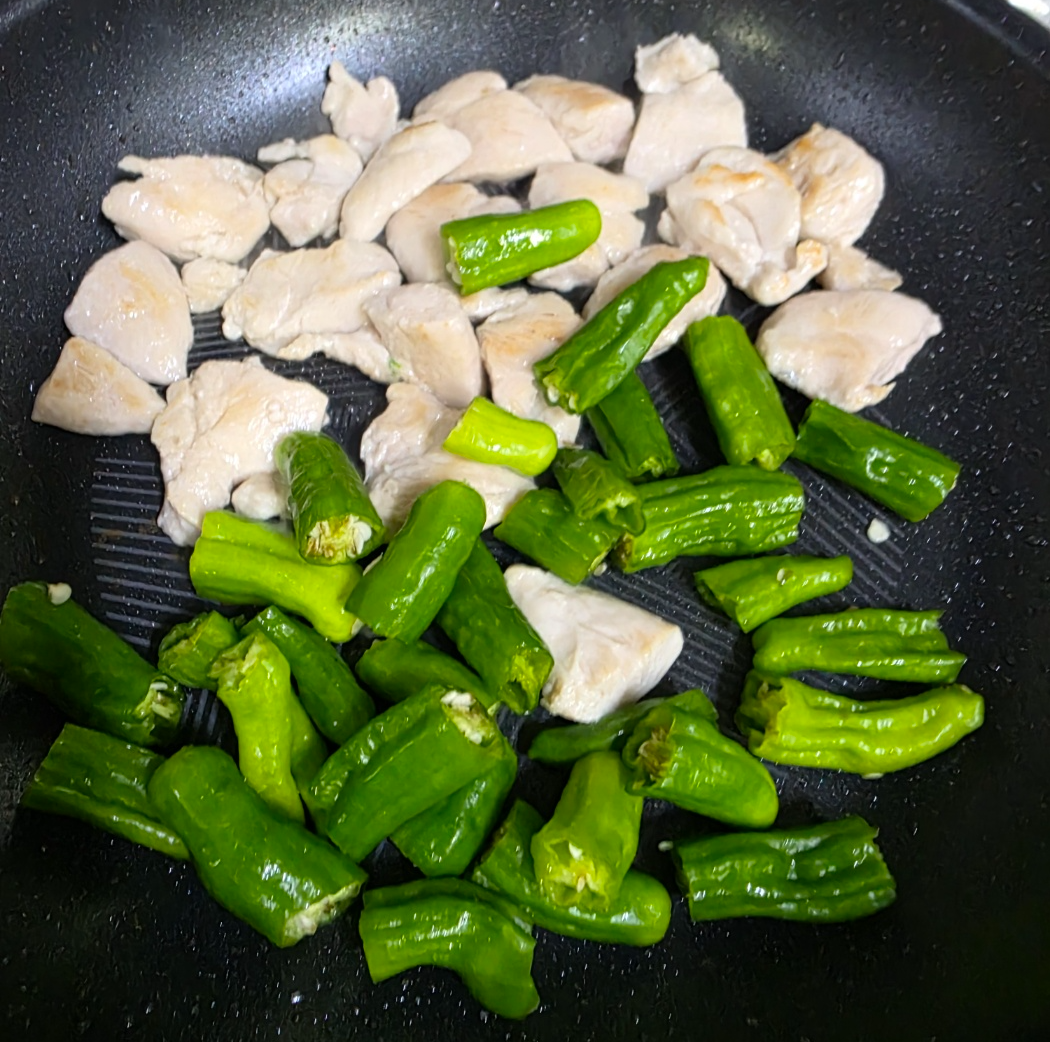 닭안심 5덩이(닭가슴살로 변경가능), 꽈리고추 한주먹, 식용유, 간장 1T