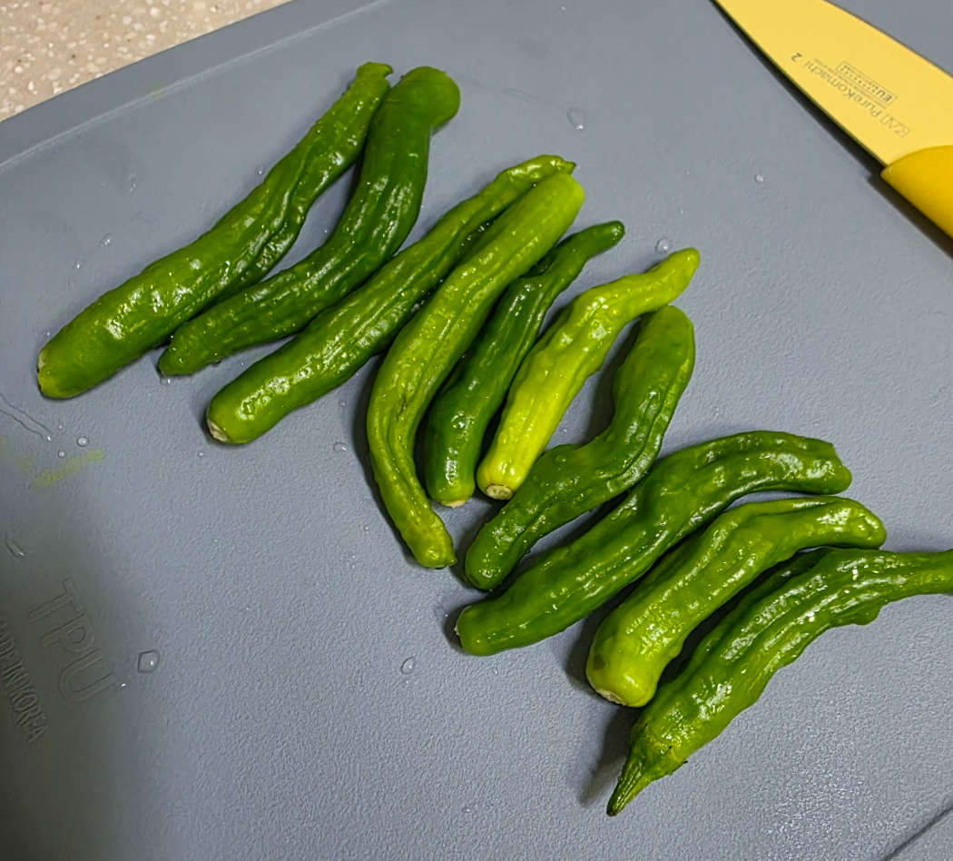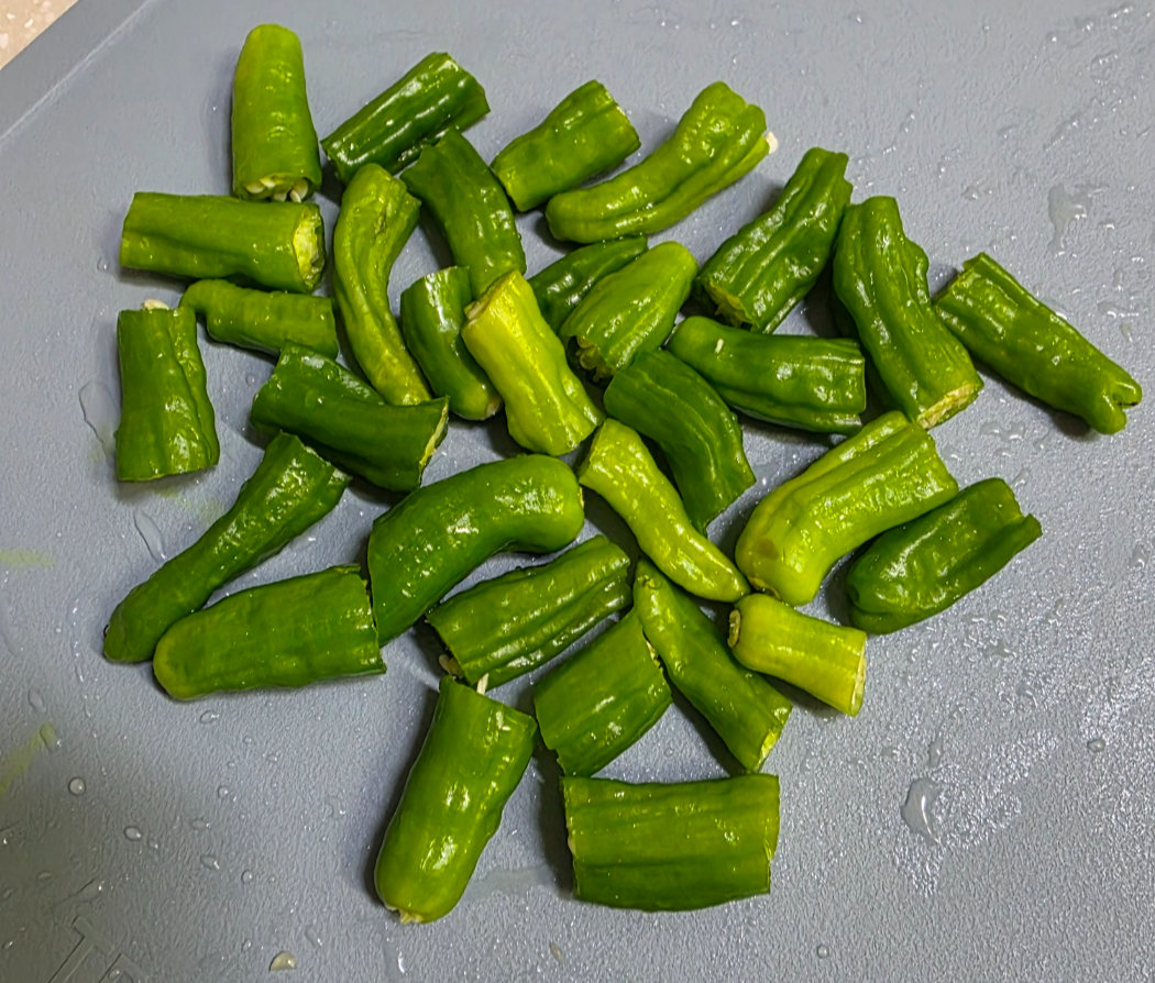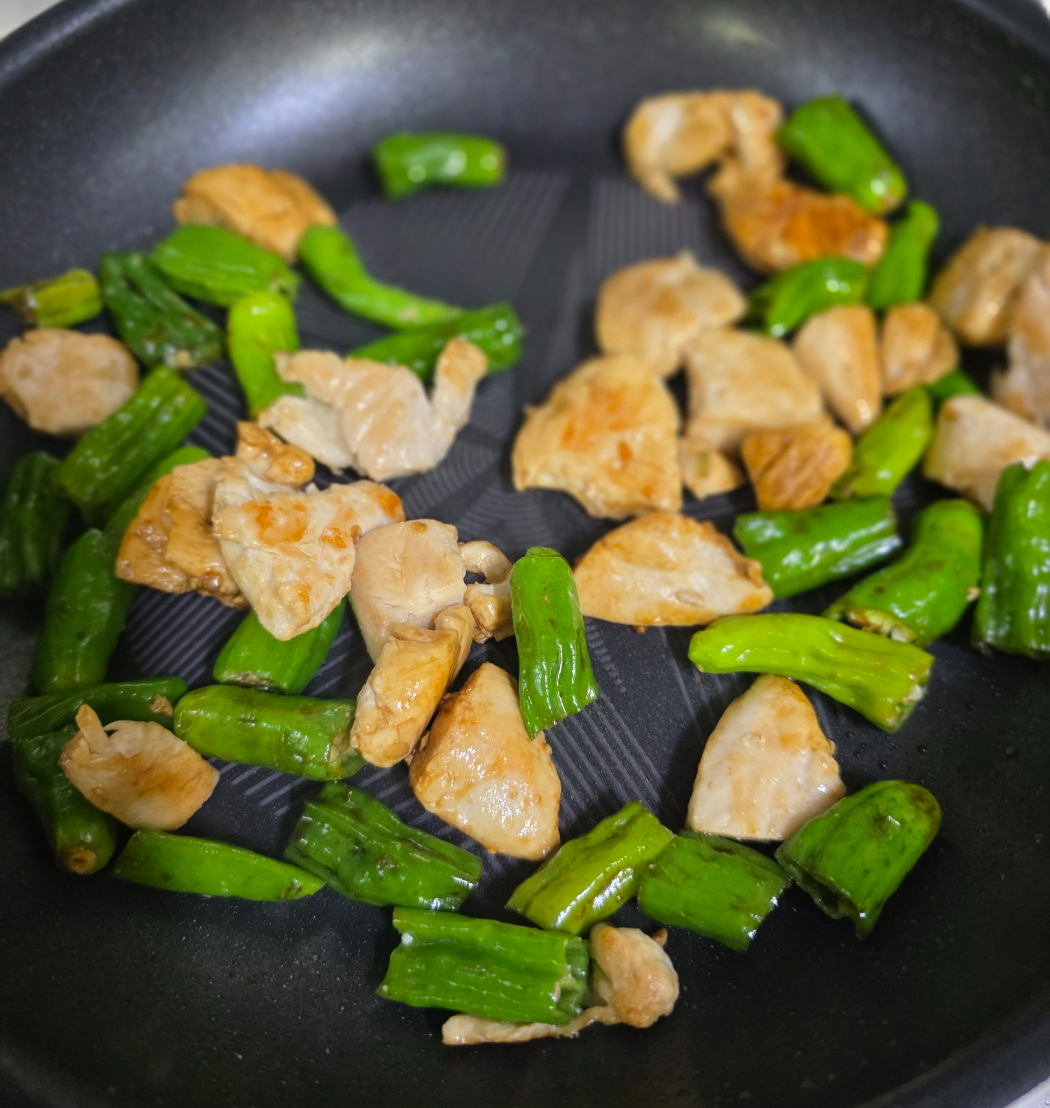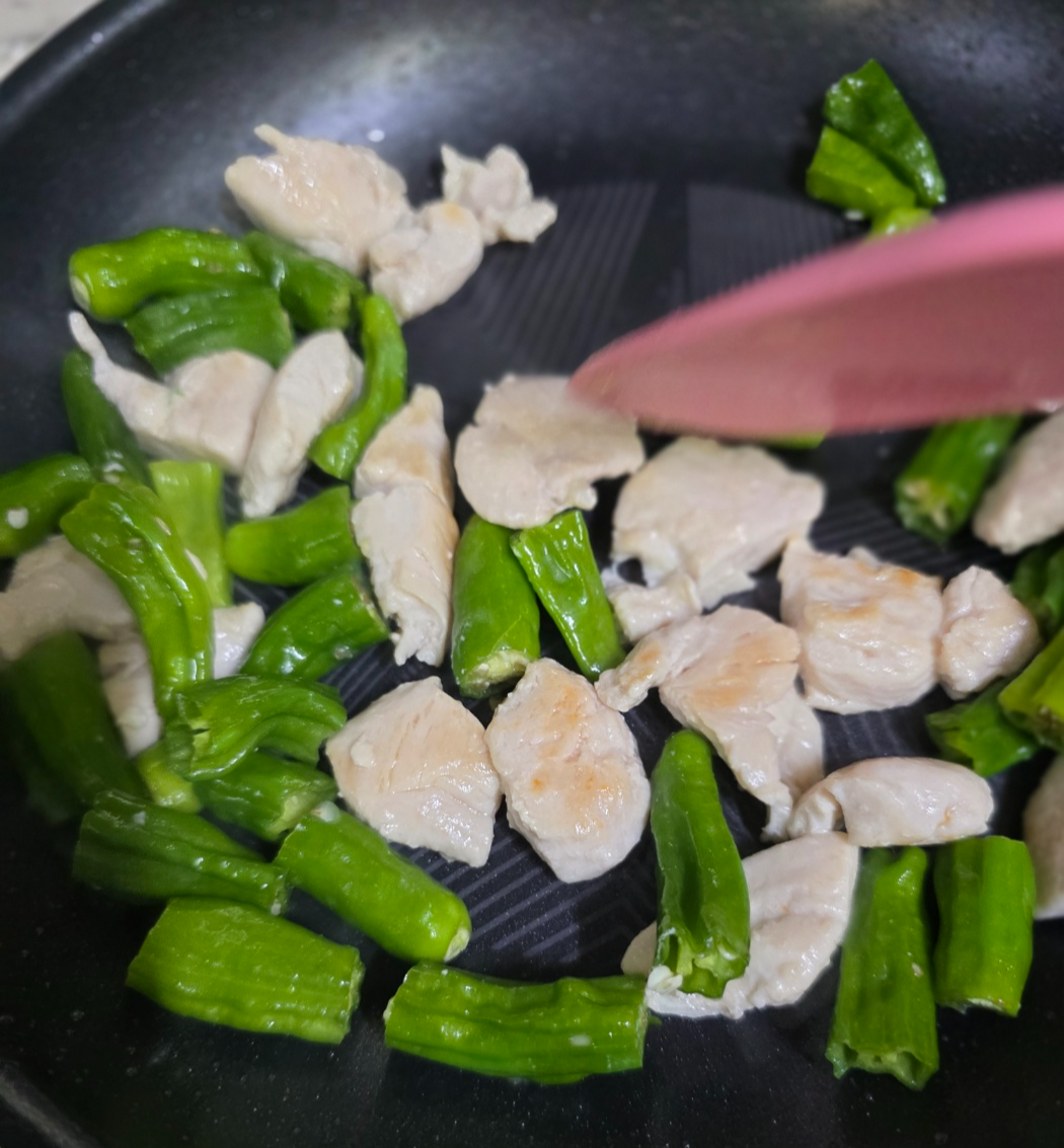 꽈리고추 한 주먹 꺼내줍니다. 닭안심만 먹으면 심심해서 저는 꼭 꽈리고추도 넣어주는데요. 양파나 좋아하는 다른 야채를 넣으셔도 됩니다.