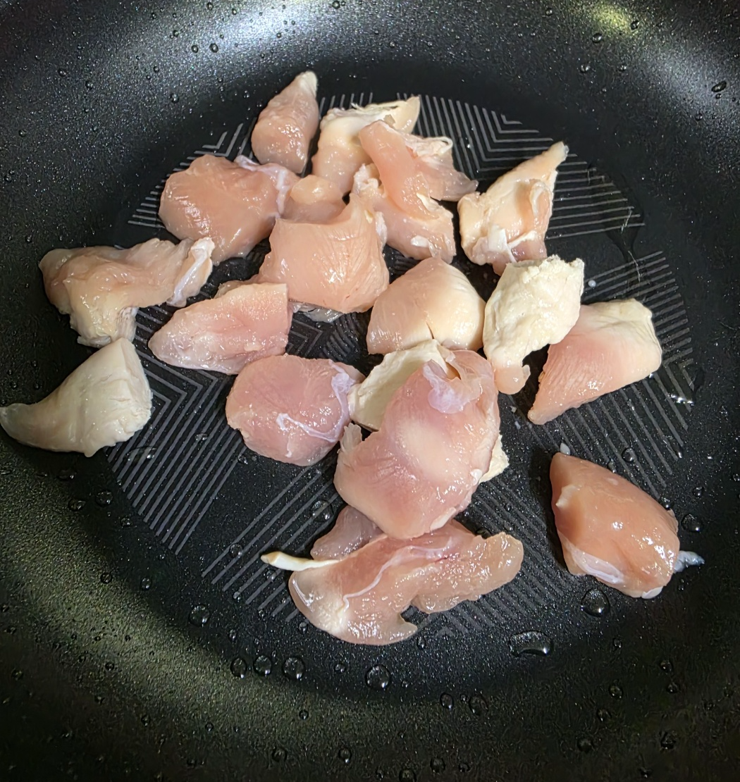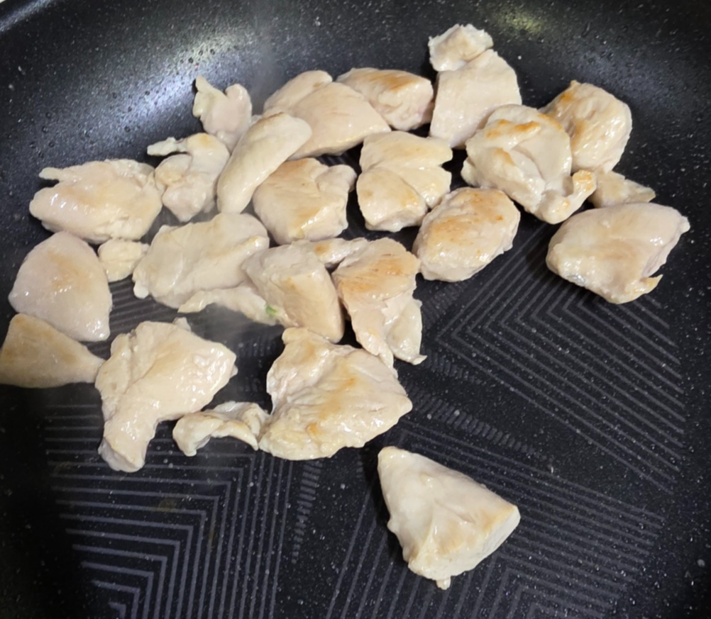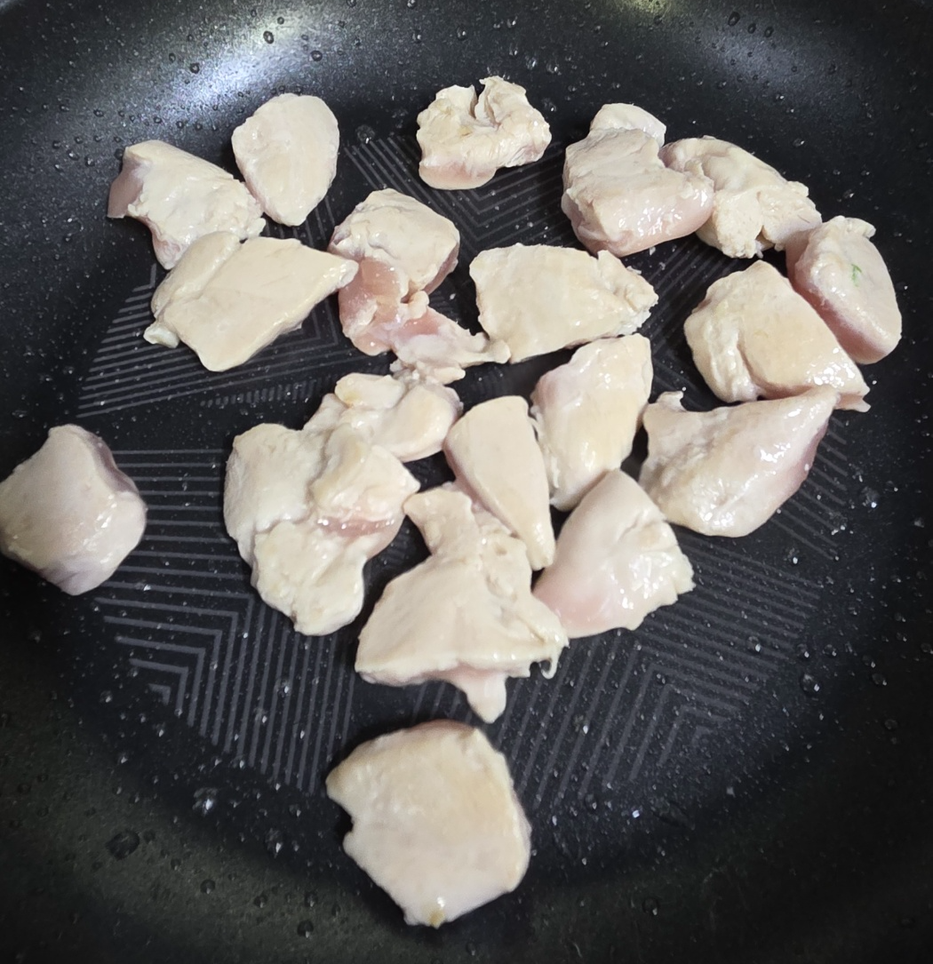 불을 켜고 팬에 기름을 두르고 썰어둔 닭안심을 올려줍니다.