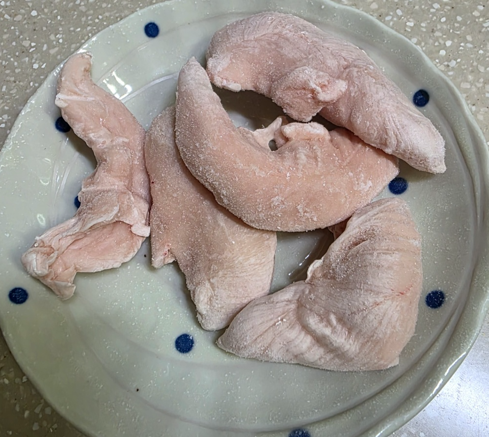하얗게 얼었던 닭안심이 붉은빛을 띠고 녹은 것 같으면 꺼내주세요.