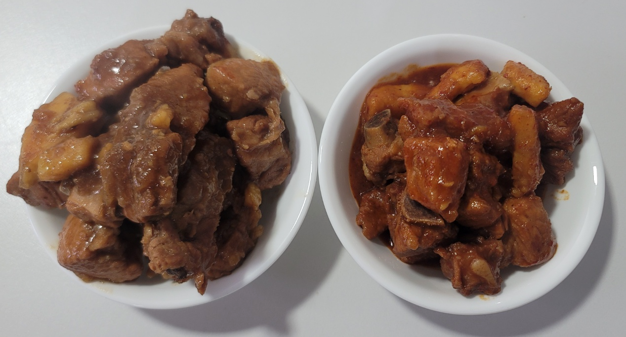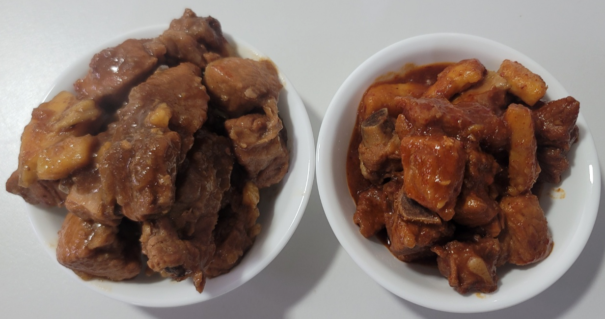 간장돼지갈비찜은 달콤하면서 짭조름해서 아이들의 밥도둑으로~ 매운 돼지갈비찜은 달콤하면서도 매콤해서 어른들의 밥도둑이 되었어요. 돼지갈비 살은 오래 끓여 부드럽고 뼈도 쏙 빠져요. 양념이 잔뜩 배어있는 고구마는 양념과 어우러져 계속 집어먹고 싶은 맛으로 변신했답니다. 진득해진 양념에 밥을 넣고 비벼먹으면 또 다른 맛을 느낄 수 있습니다. 정말 정말 추천하고 싶은 맛입니다. 집에서 돼지갈비찜과 맛있는 저녁 한상 드셔보세요~