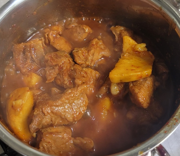 돼지갈비찜이 맛있게 졸여집니다. 일반적인 돼지갈비찜에 케첩과 고춧가루만 추가했을 뿐인데 완전히 다른 요리가 되었어요.