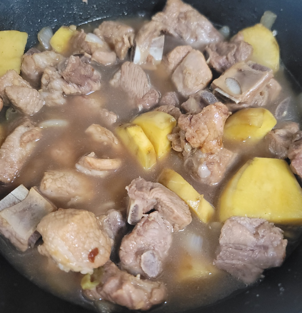 썰어놓은 양파와 고구마를 넣어줍니다. 고구마를 넣으면 단맛이 올라오고 고구마 전분 때문에 국물이 진득해져 밥이랑 비벼 먹어도 맛있는 돼지갈비찜이 되는 것 같아요. 돼지갈비찜을 할 때 고구마는 꼭 넣어요.