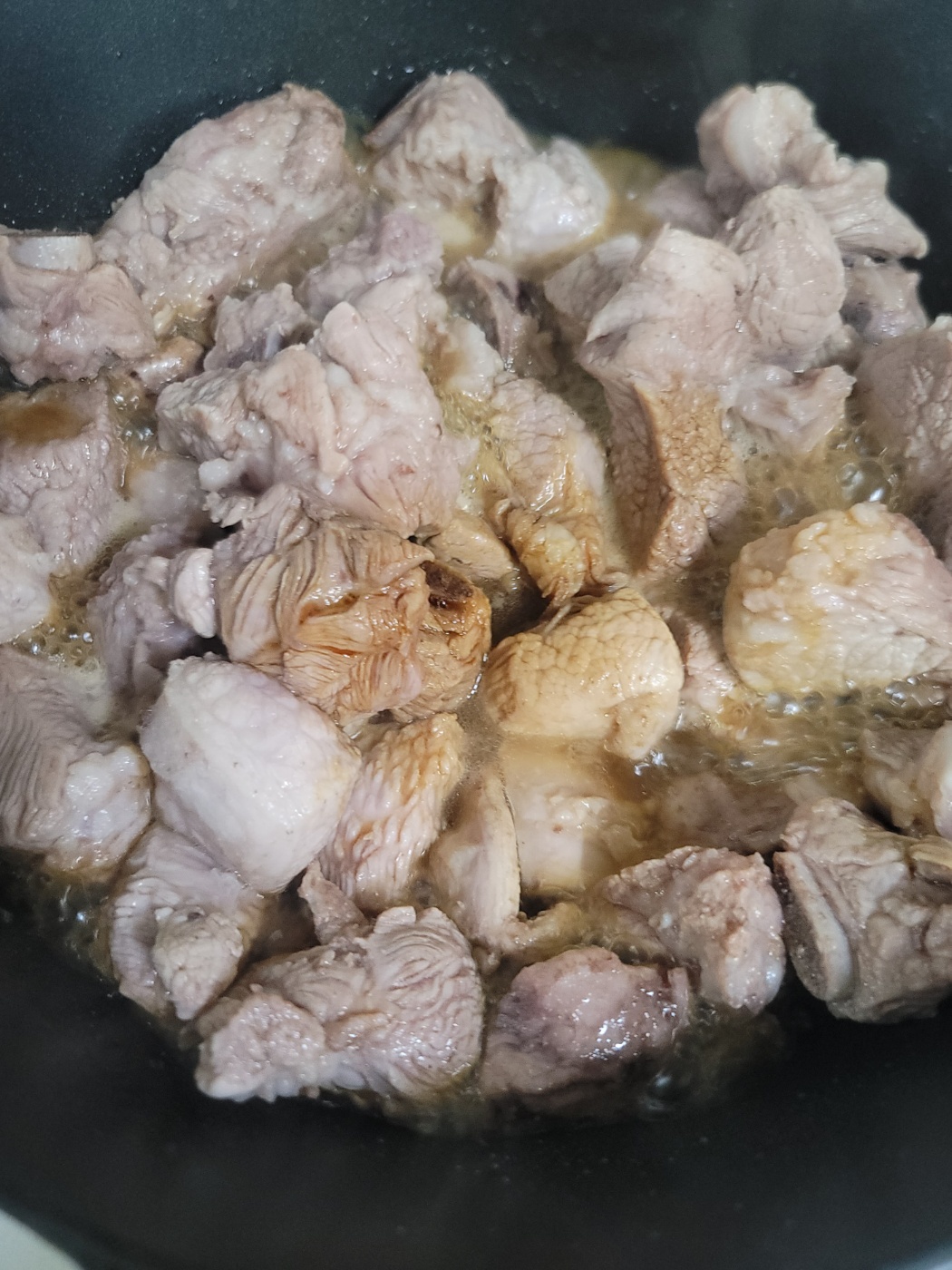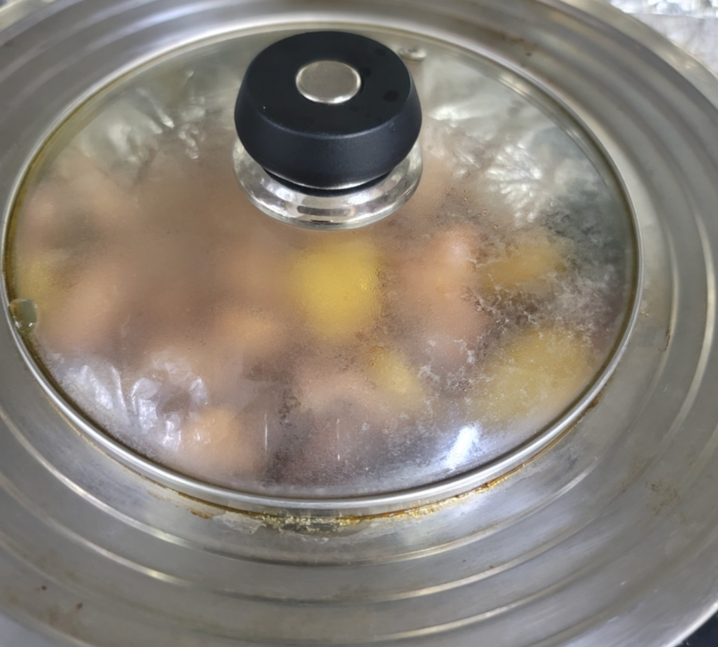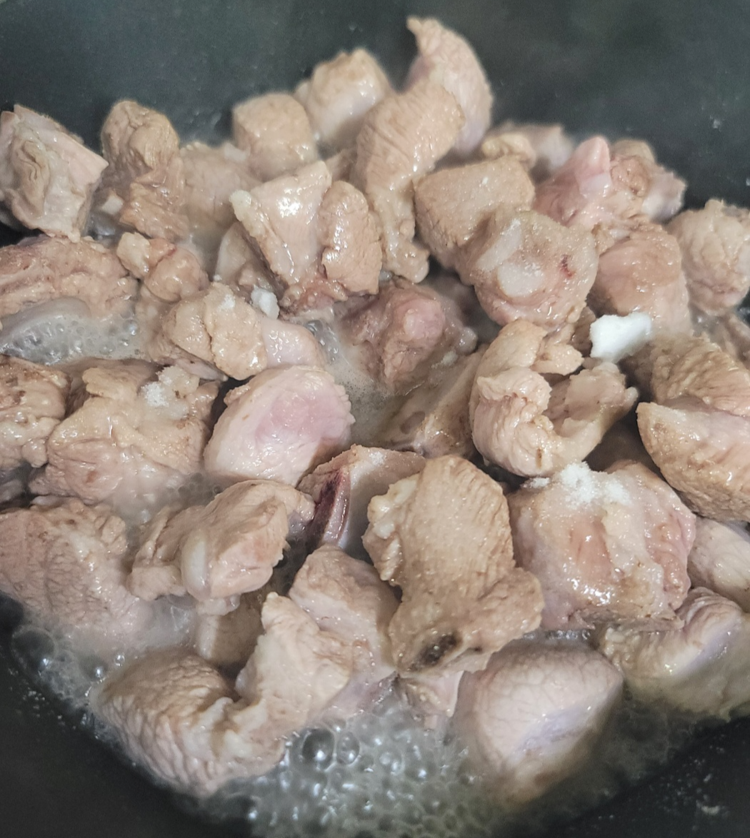 물을 돼지갈비가 잠길 정도로 넣고 중불로 30분 정도 끓여줍니다. 물이 부족하면 중간에 추가해도 됩니다.