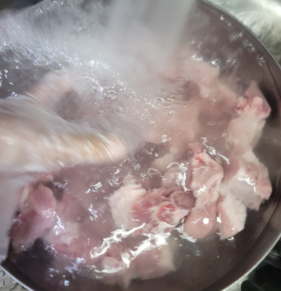 물에 담갔던 돼지고기를 뼛가루와 불순물 제거를 위해 흐르는 물에 충분히 씻어주고 최대한 물을 빼주세요.