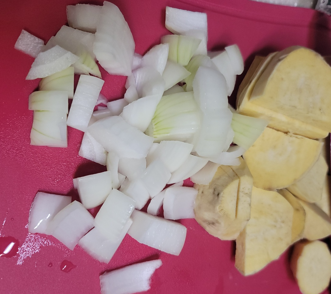 양파 1개를 적당한 크기로 썰어주고 고구마 2개는 1.5cm 두께로 큼직하게 썰어줍니다.