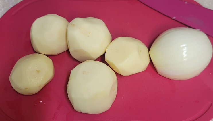 감자 5개와 양파 반개를 깨끗하게 손질해줍니다.
