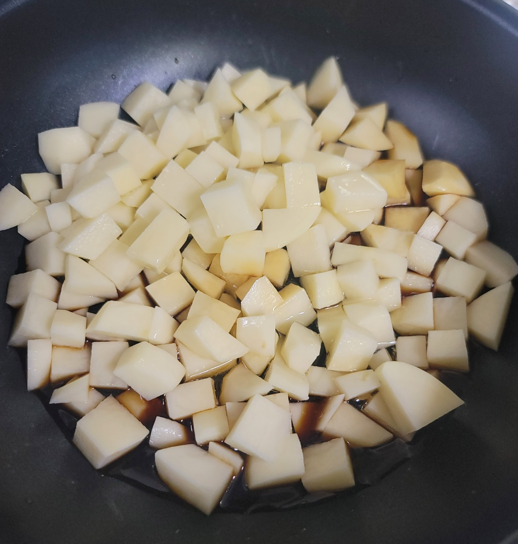 감자는 깍둑썰기 해줍니다. 너무 크지도 작지도 않은 크기로 해야 감자조림을 했을 때 안 익거나 으깨지지 않습니다.