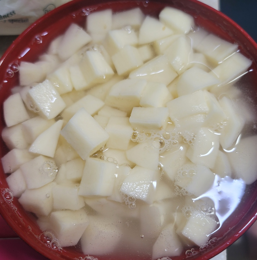 감자를 전분물이 나오지 않을 때 까지 몇 번 헹궈줍니다. 헹군 후 감자를 10분 정도 물에 담가줍니다. 전분기를 없애야 조림으로 만들었을 때 텁텁한 맛이 나지 않고 으깨지지 않아요.