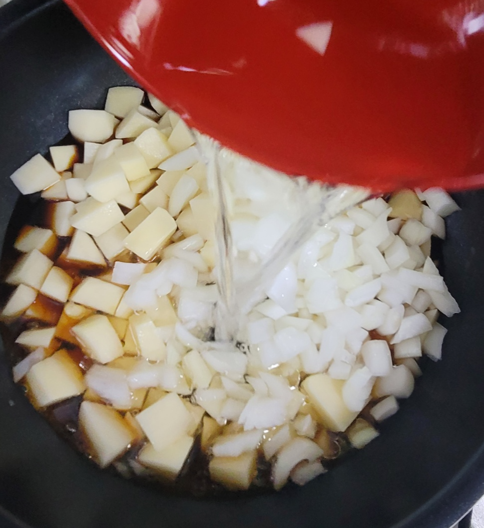 양파도 넣고 물을 감자가 완전 잠기지 않을 정도만 넣어주세요.