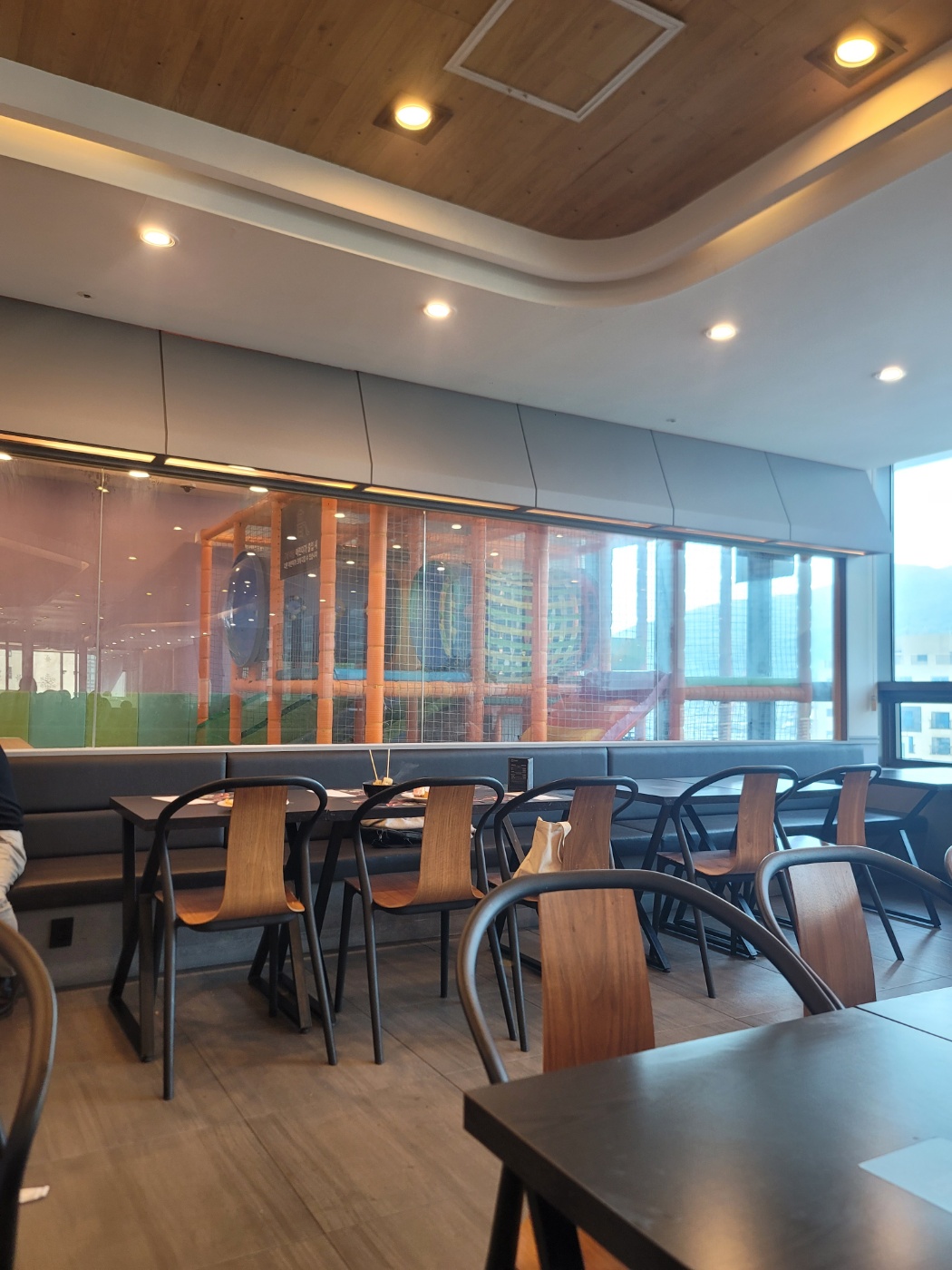 주말이지만 애매한 시간에 방문해서인지 대기 없이 바로 입장했습니다. 아이들과 방문해서인지 놀이방과 가까운 자리를 배정받았어요. 창밖으로 북한산이 보입니다.