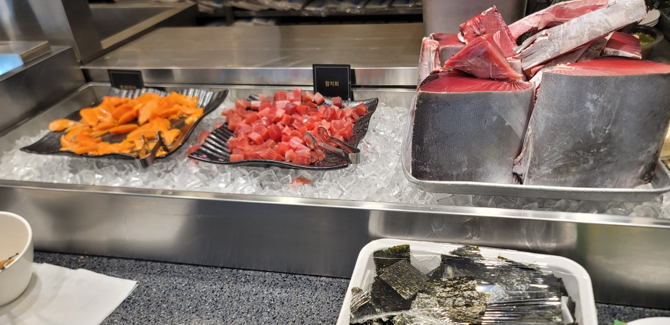 참치회, 훈제연어를 지나면 골뱅이, 오징어숙회, 간장게장 등 다양한 해산물이 있습니다. 셰프님이 참치 덩어리를 직접 가져가서 손질하는 모습도 보았네요.