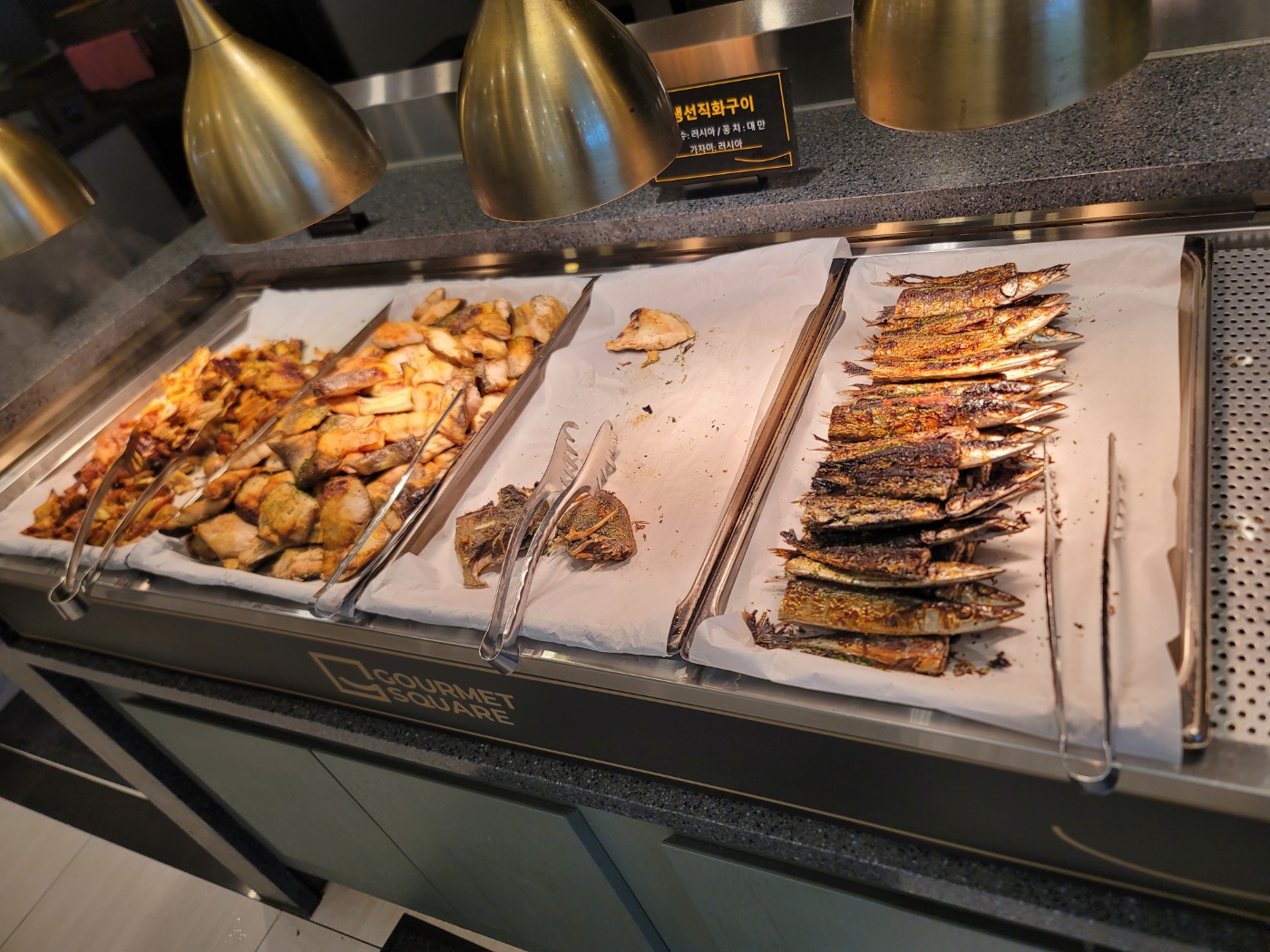 자리와 가까운 곳부터 쭉 둘러봅니다. 고메스퀘어의 가장 좋은 점! 집에서는 냄새 때문에 생선 굽기가 힘든데 고메스퀘어에선 생선구이를 마음껏 먹을 수 있어요.