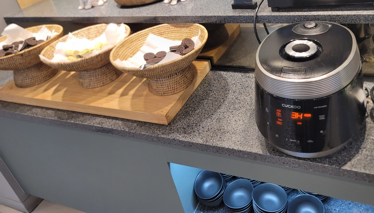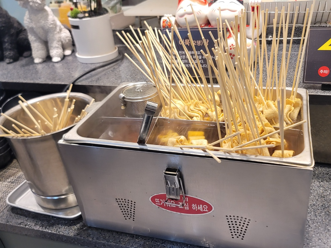어묵이 꼬치에 하나씩 꼽혀있는 어묵탕과 흰쌀밥, 쿠키들과 커피머신, 주스와 음료들도 있습니다.