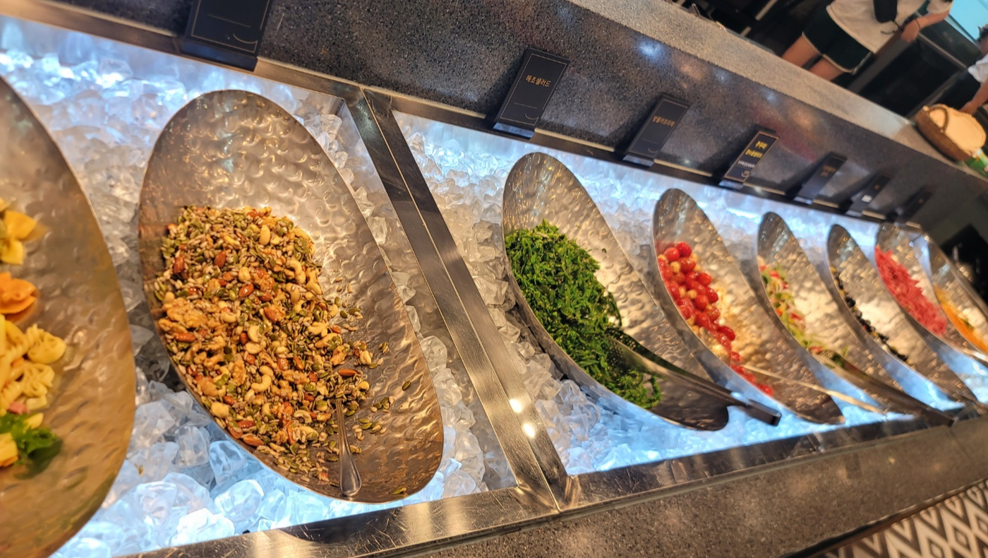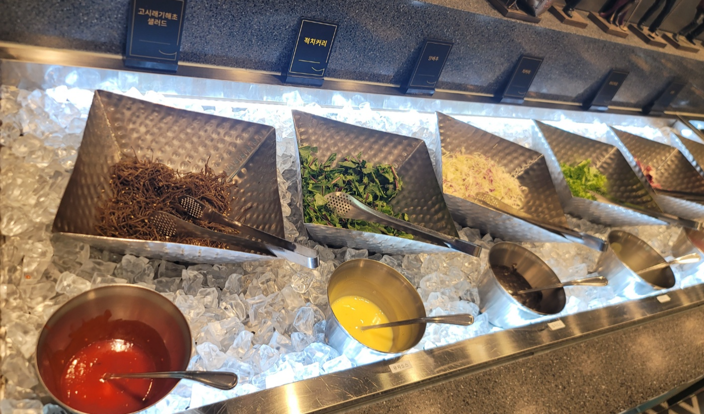 건강 챙기는 시간~ 샐러드 종류와 포케가 있는 게 특이했습니다. 육회와 쫄면도 있어요.