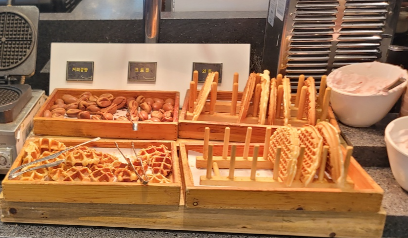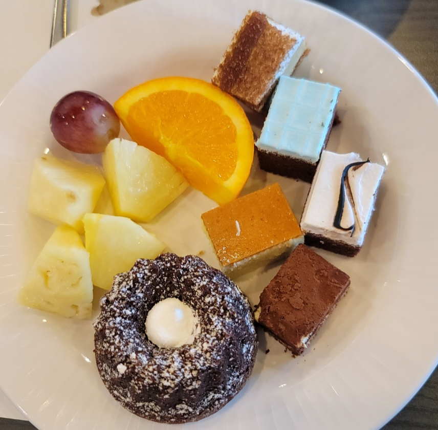 망고요거트로 잠시 쉬어주고 디저트를 담아왔어요. 케이크는 다 무난했고 파인애플이 아삭한데 맛있더라고요. 파인애플이 소화에 좋은 거 아시죠~ 뷔페 갔을 때 꼭 챙겨 먹는 과일입니다. 크로플도 맛있었어요~ 커피와 잘 어울립니다.