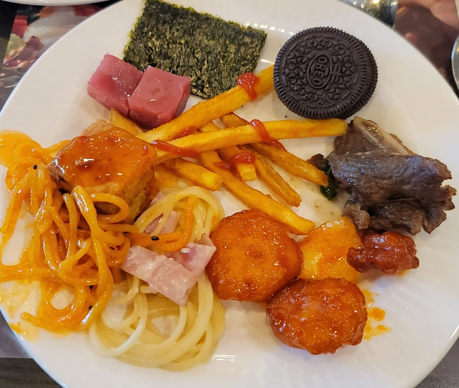 아이를 위한 한 접시를 먼저 뜹니다. 맵지 않은 음식이 많아서 좋았어요. 특히 까르보나라와 짜장면, 생선을 잘 먹었답니다.
