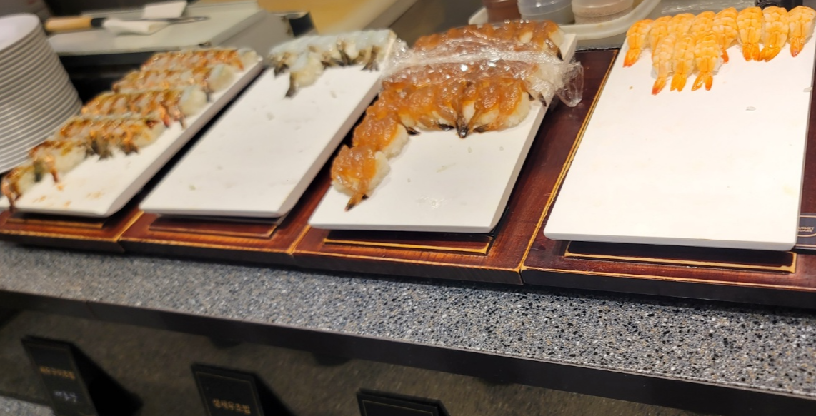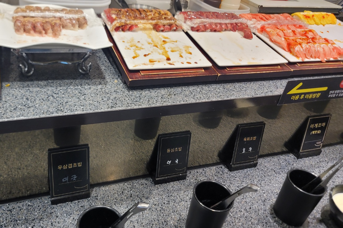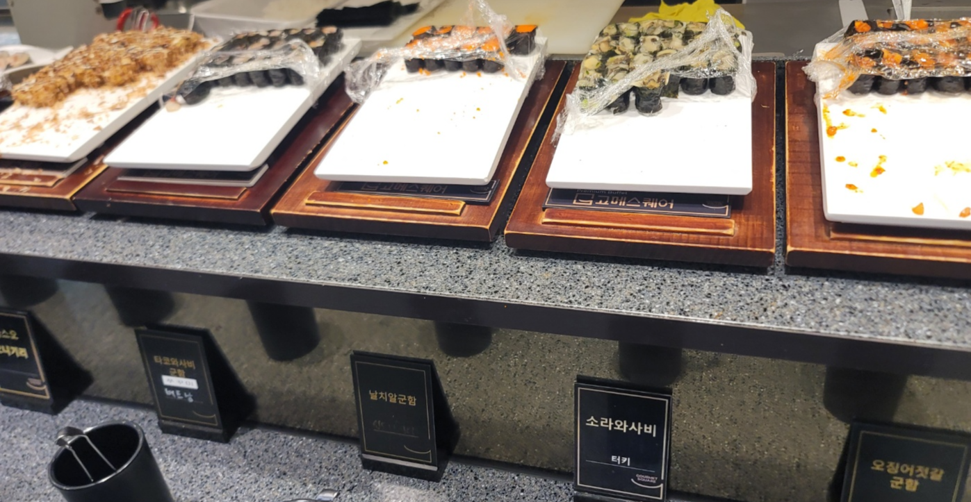 다양한 초밥과 군함, 롤까지 준비되어 있습니다. 한 가지 음식마다 집게와 집게를 넣는 통이 있는 게 인상적이네요.