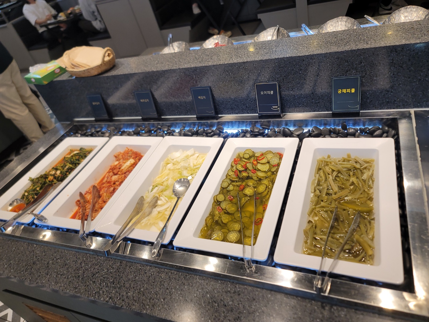 자칫 느끼할 수도 있으니 매콤 새콤한 반찬들도 보이고요. 요거트는 플레인과 망고요거트 두 가지가 있습니다.