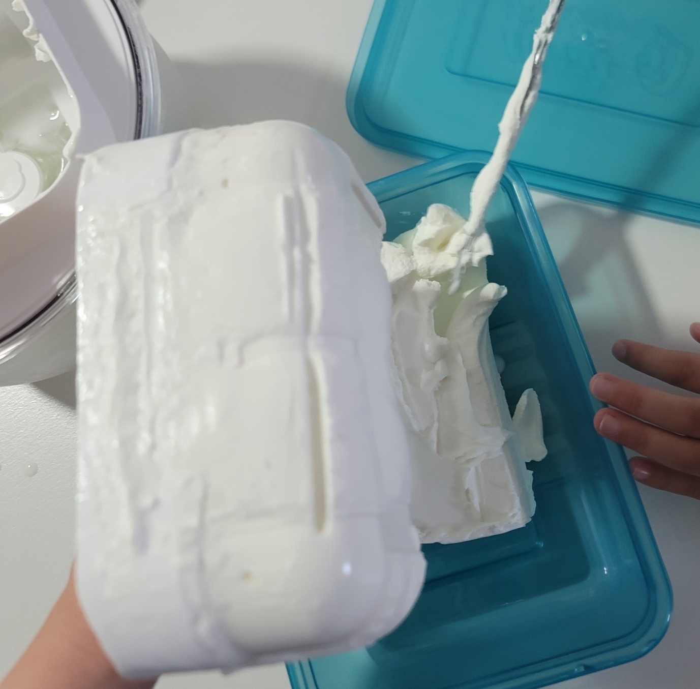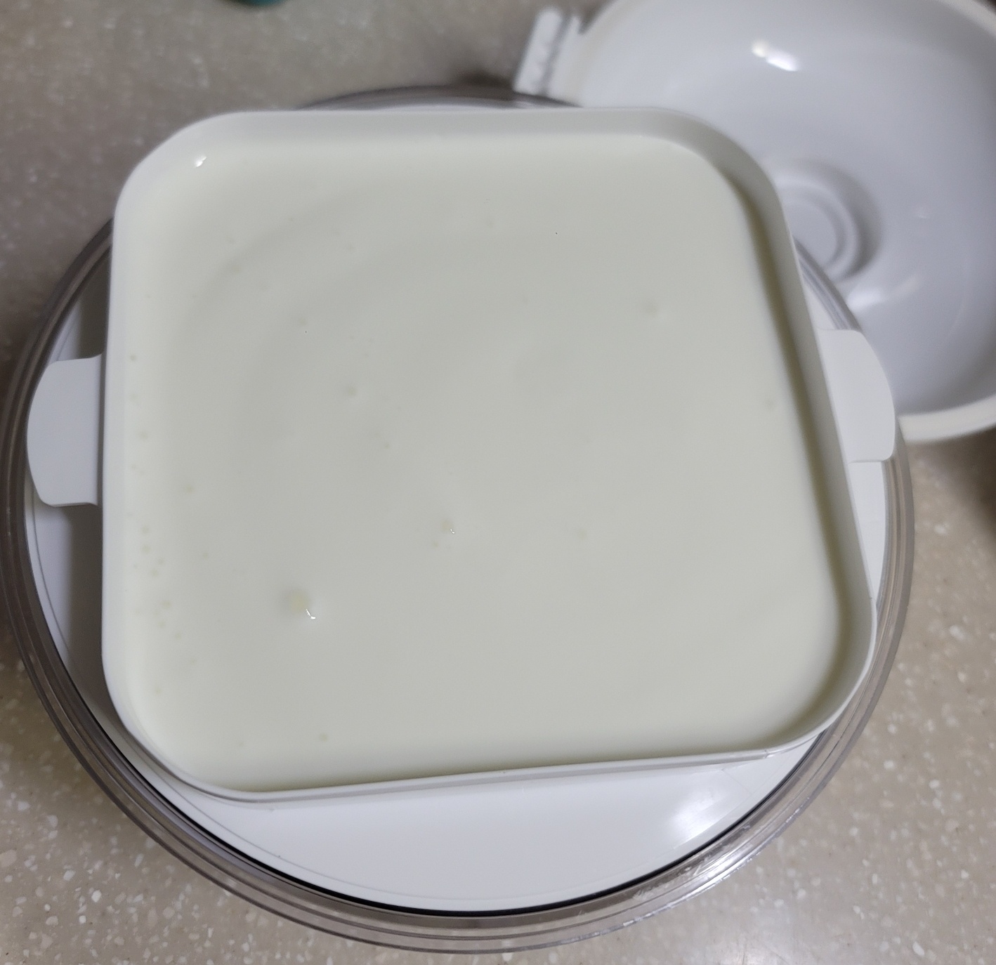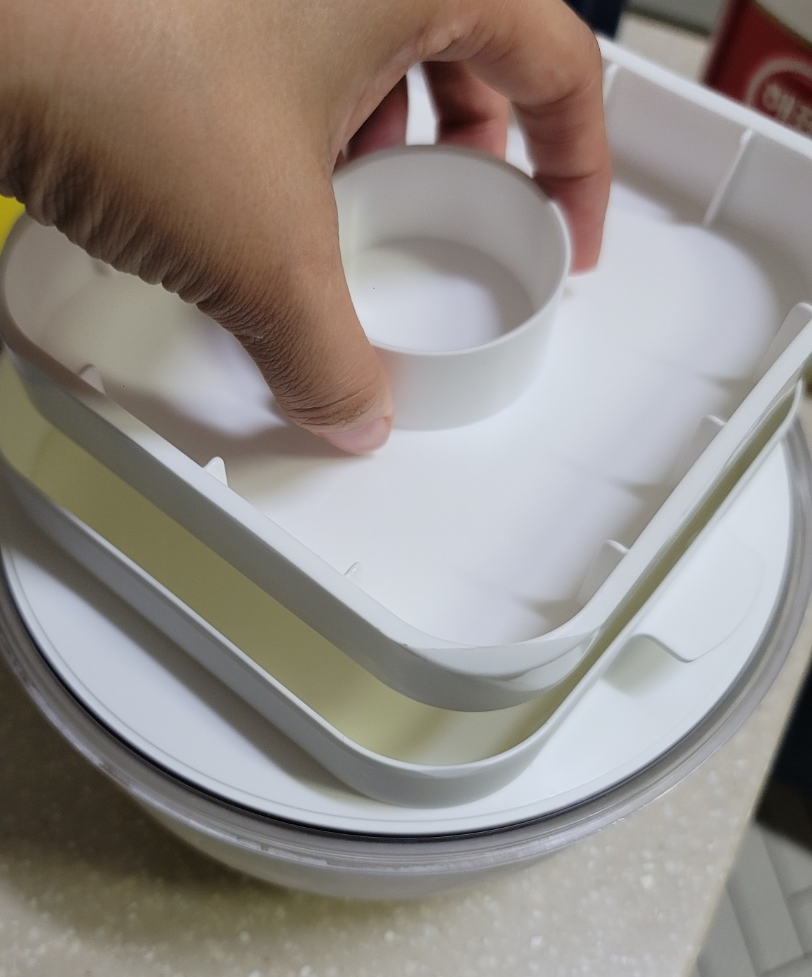 짜잔!!!!!! 이렇게 누름판에 그릭요거트 덩어리가 붙어 나오면 성공입니다. 작년 베어그릭스라 누름판에 역류방지실리콘이 없어서 누름판 위로 조금 역류했어요. 신상 베어그릭스를 사고 싶네요.