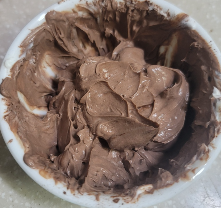 초콜릿 생크림 같은 비주얼이 나옵니다. 저 상태로 먹어도 맛있어요. 초콜릿이랑 맛이 많이 흡사합니다. 카카오 분말과 알룰로스가 요거트의 시큼한 맛을 많이 잡아주네요.