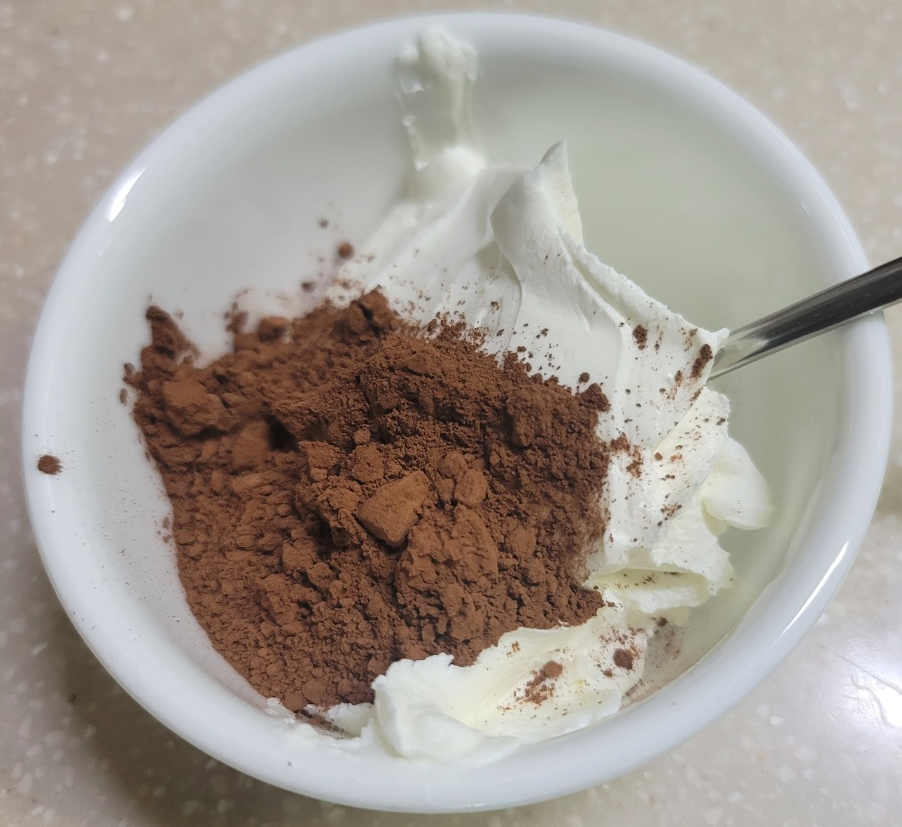 그릭요거트를 크게 한 스푼 떠서 준비해 줍니다. 카카오 분말 3T를 넣어주고 섞어줍니다. 세게 섞으면 카카오 분말이 사방으로 날리기 때문에 조심해서 섞어주세요. 잘 섞다가 알룰로스 3T도 넣어줍니다. 알룰로스는 개인 취향대로 넣어주셔도 무방합니다. 골고루 섞이도록 계속 섞어주세요.