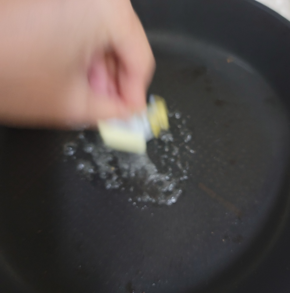 달궈진 후라이팬에 버터를 녹여줍니다. 마가린으로 하면 더 길거리토스트맛이 나겠지만 너무 대용량으로 판매해서 버터로 대신해 줍니다.