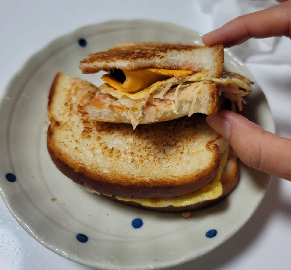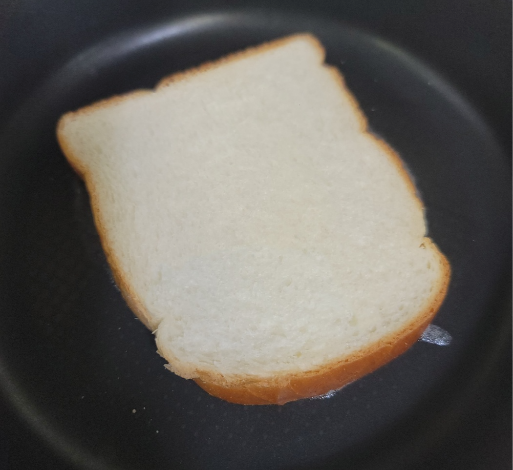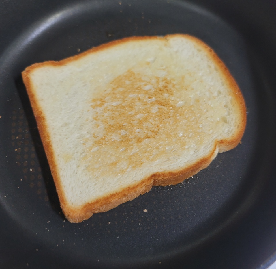 녹인 버터 위에 식빵을 놓아줍니다. 밑면이 노릇노릇해지면 또 버터를 팬에 녹이고 뒤집어줍니다. 양면이 노릇 바삭하게 만들면 됩니다. 새 식빵으로 한 번 더 반복해 주세요.