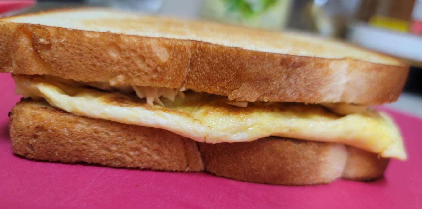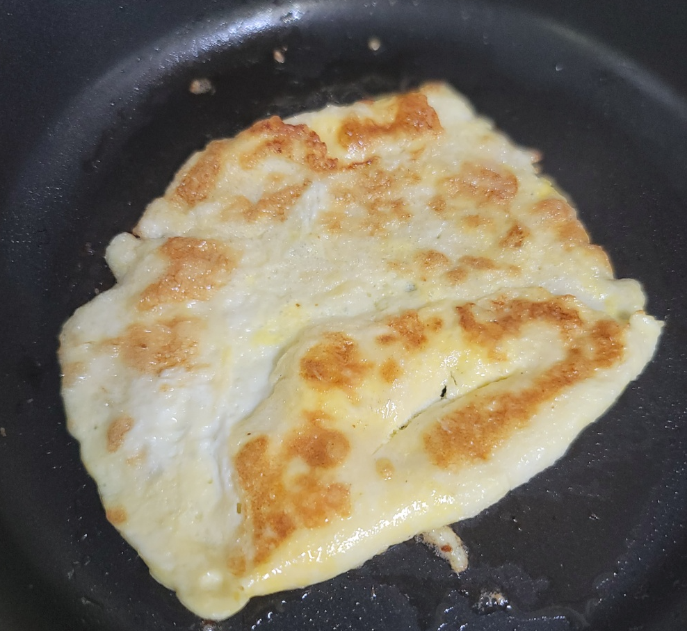 마찬가지로 달궈진 팬에 버터를 녹이고 풀어둔 계란을 올려줍니다. 나름 식빵크기에 모양을 맞춰서 앞뒤 노릇하게 익혀줍니다.