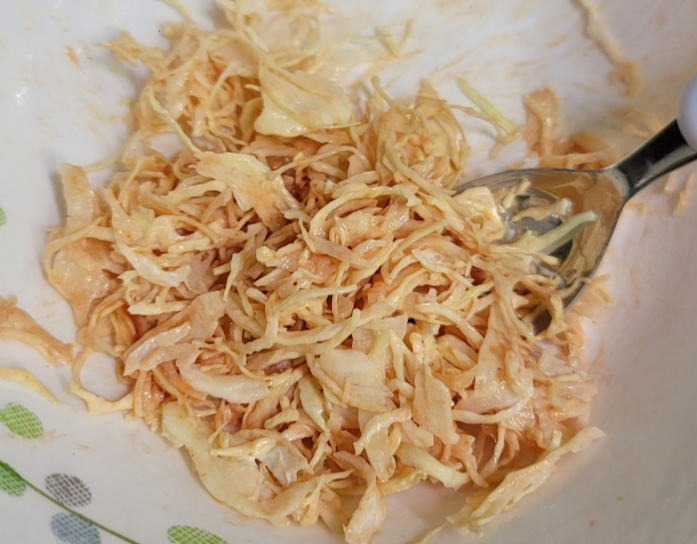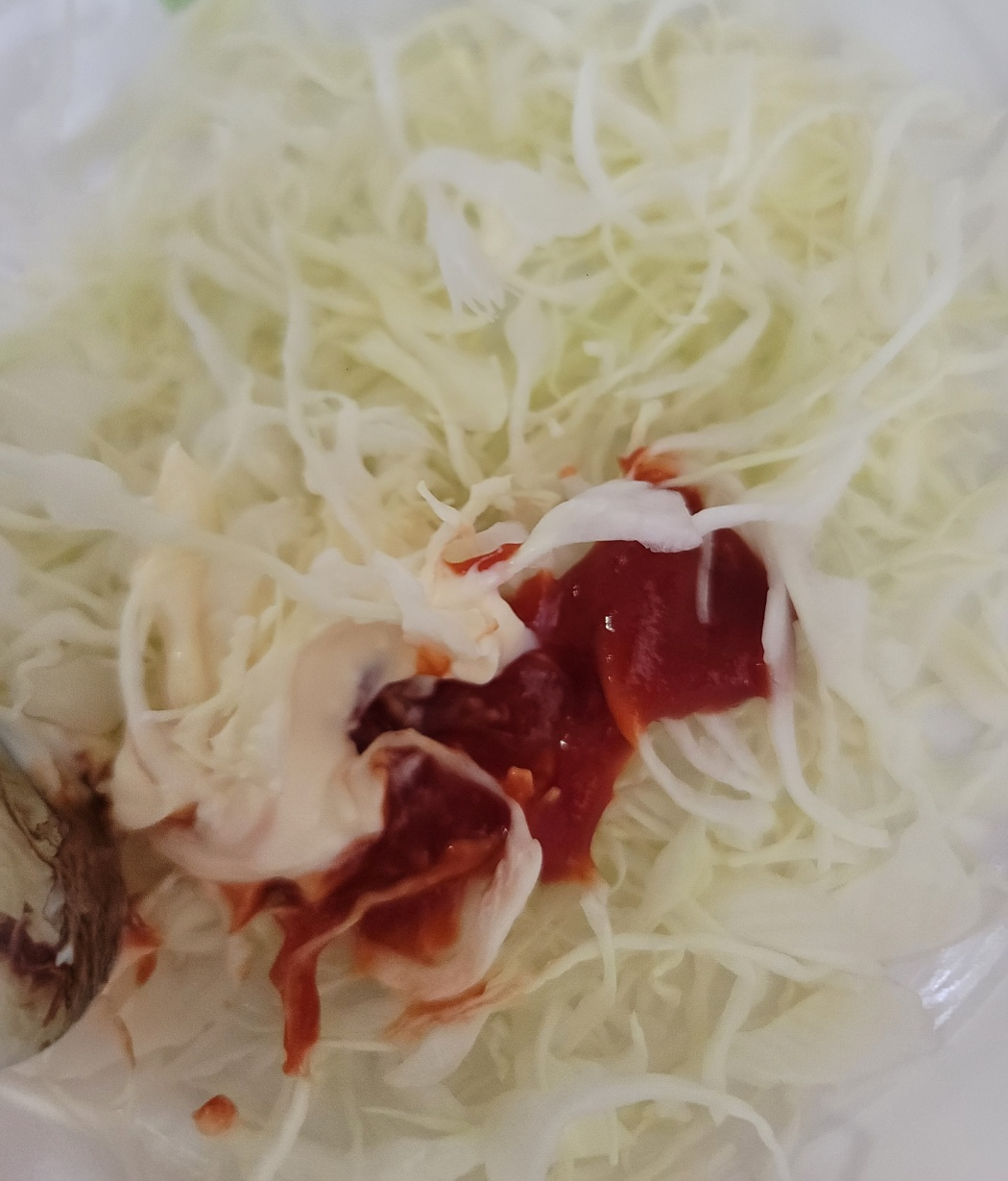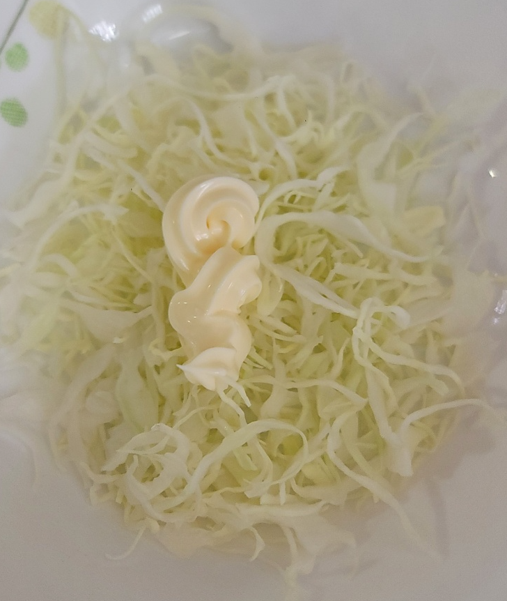 양배추를 얇게 채썰어주세요. 양배추샐러드를 토스트에 많이 넣을수록 더 맛있어요. 마요네즈와 케첩을 적당히 넣고 섞어줍니다. 맛있는 양배추샐러드가 벌써 완성됐습니다.