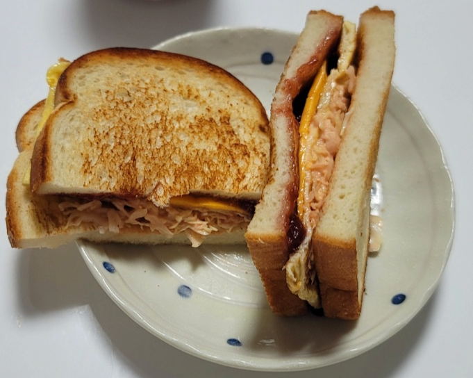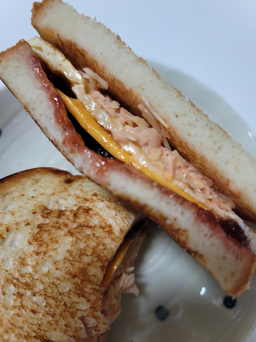 식빵 2개, 딸기잼, 양배추, 치즈, 계란 2개, 케찹, 마요네즈, 버터