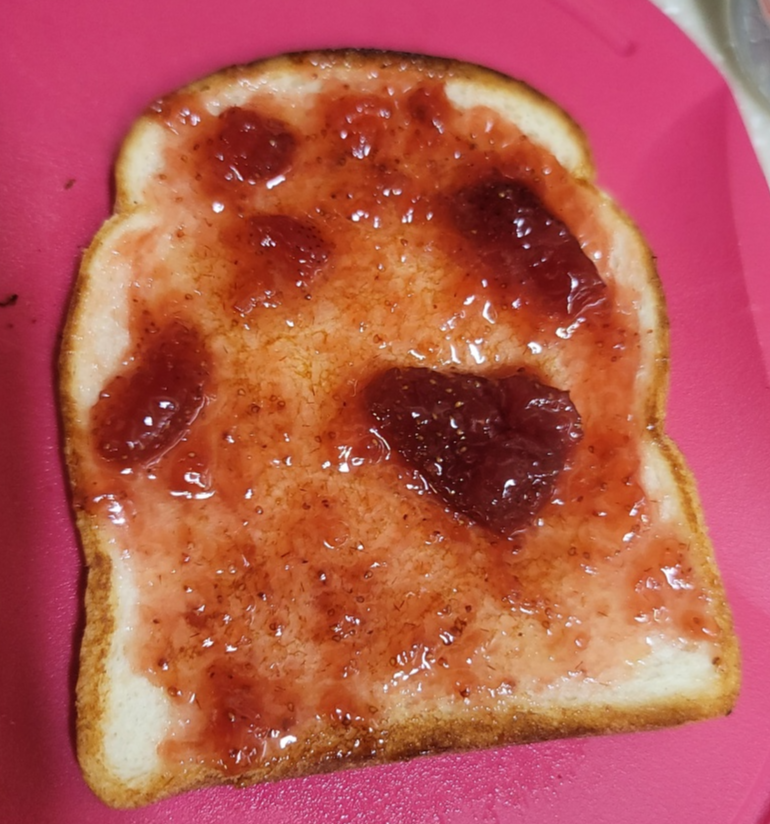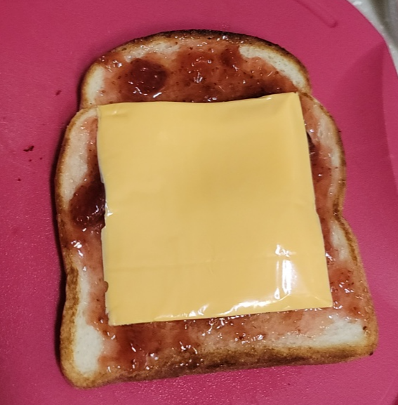 식빵 한 면에 딸기잼을 발라주고 그 위에 치즈를 올려줍니다. 딸기잼이 없으면 설탕으로 대체해 주세요.