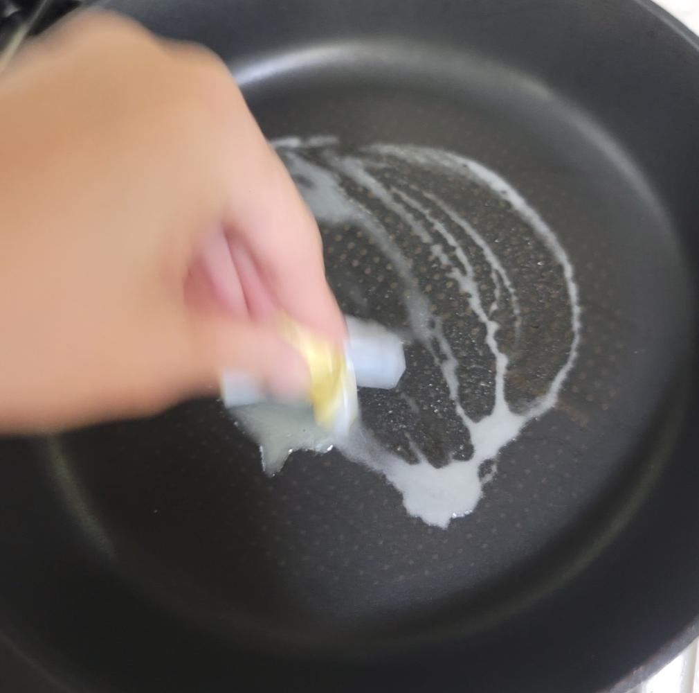 달궈진 후라이팬에 버터를 녹여줍니다. 마가린으로 하면 더 길거리토스트맛이 나겠지만 너무 대용량으로 판매해서 버터로 대신해 줍니다.