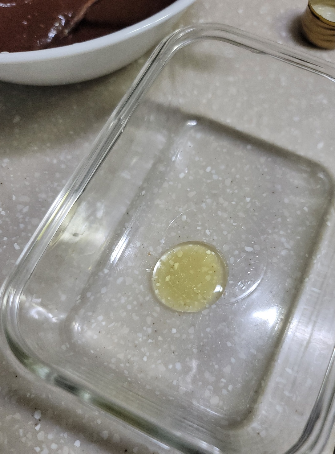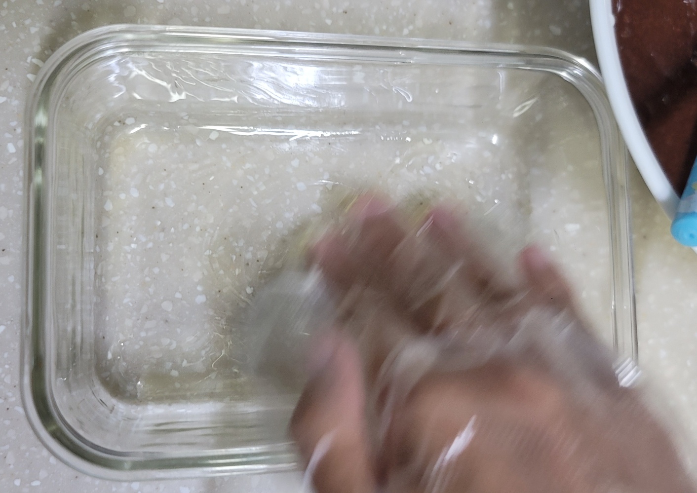 전자레인지에 돌릴 수 있는 용기에 올리브유를 조금 넣어서 안쪽 면에 발라줍니다. 기름 바르는 붓이 없어서 비닐장갑 끼고 손으로 발라줬어요.