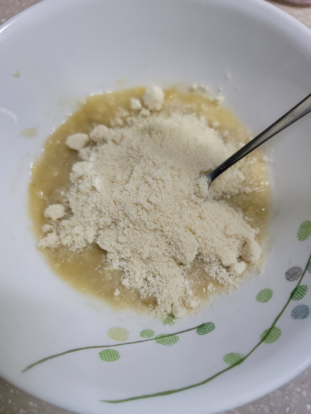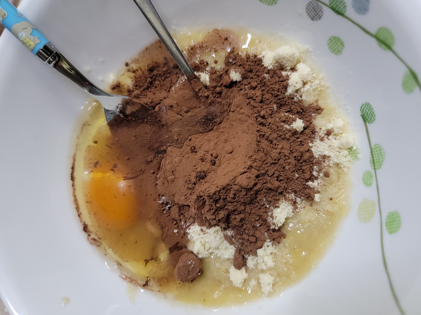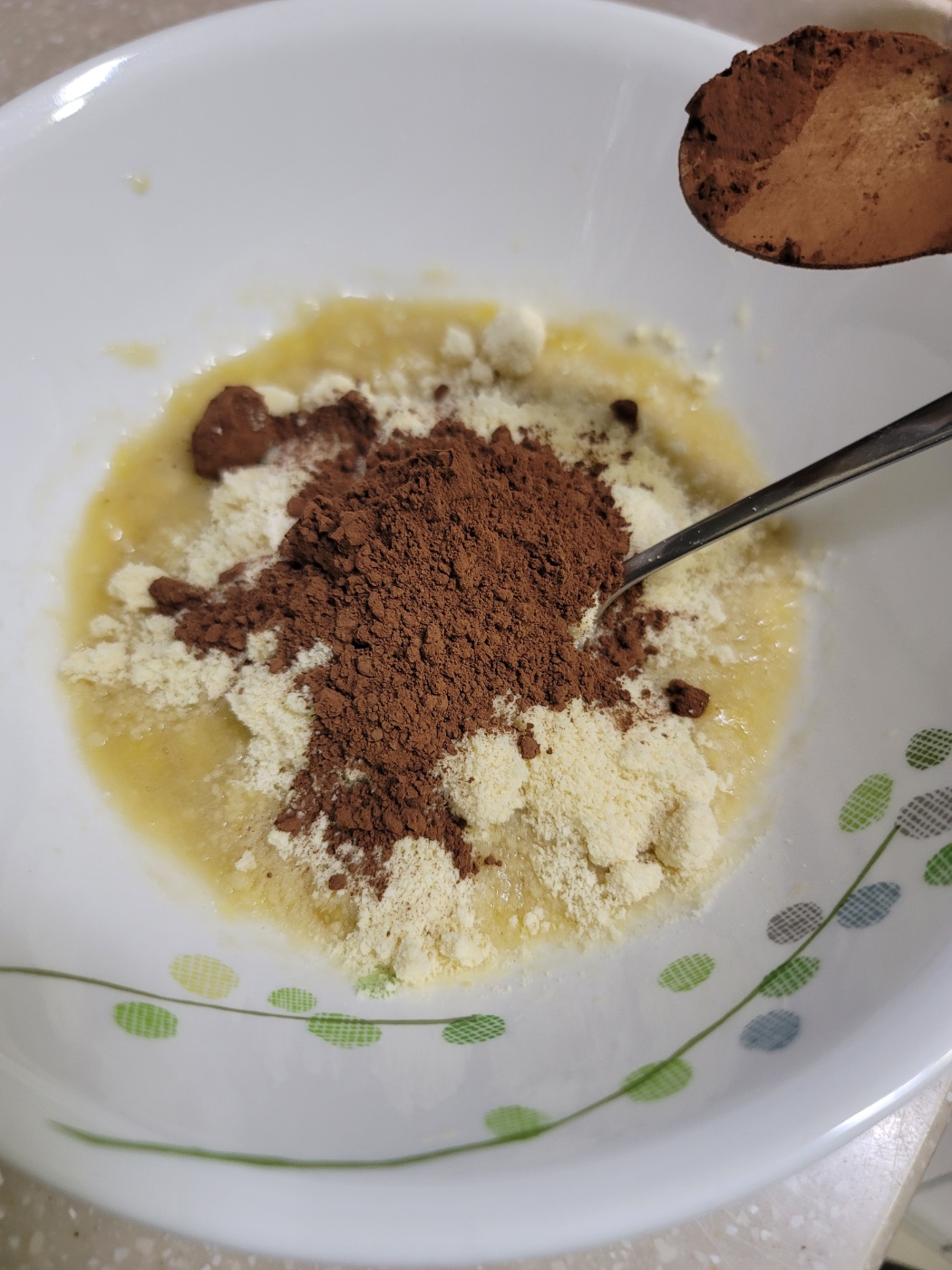 으깬 바나나 위로 아몬드가루 9T, 카카오분말 3T를 넣어줍니다. 카카오 향이 입맛 돌게하네요.