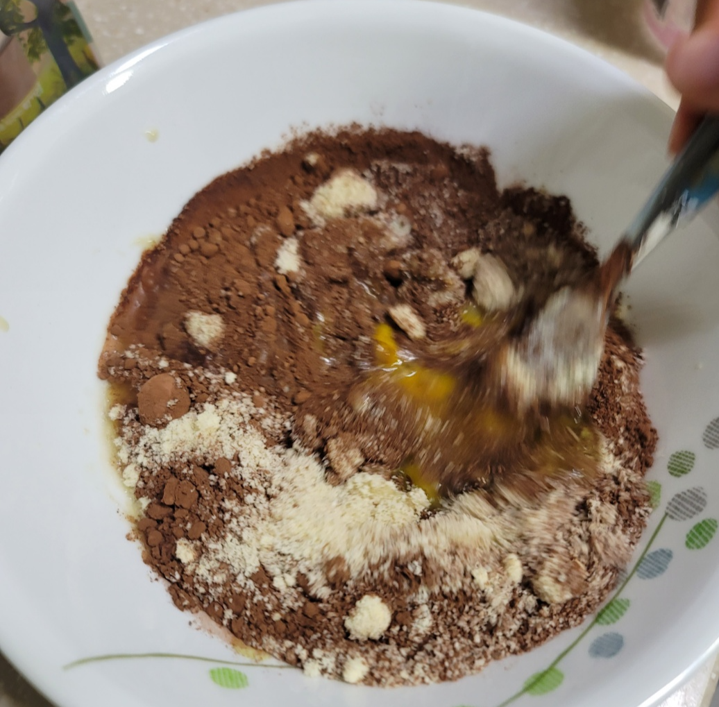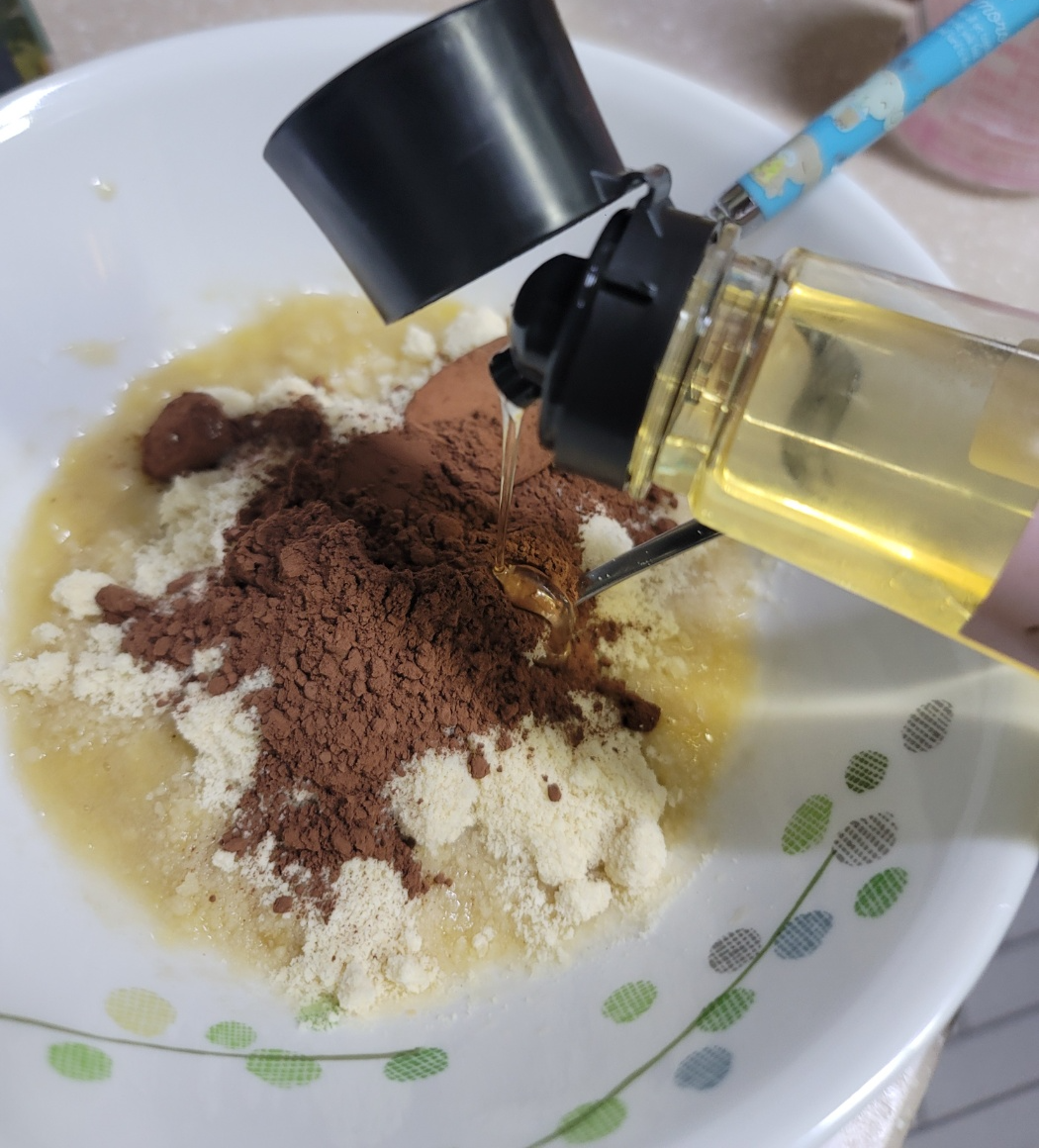 아몬드가루 9T, 무첨가카카오분말 3T, 알룰로스 2T, 달걀 1개, 바나나 1개, 올리브유(식용유대체가능)