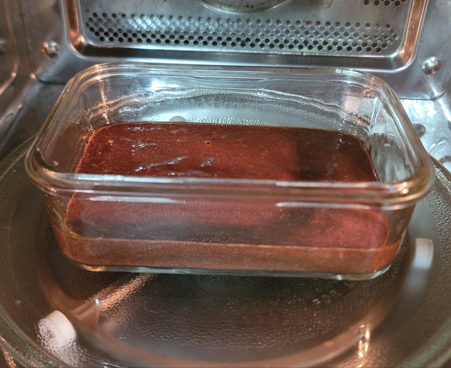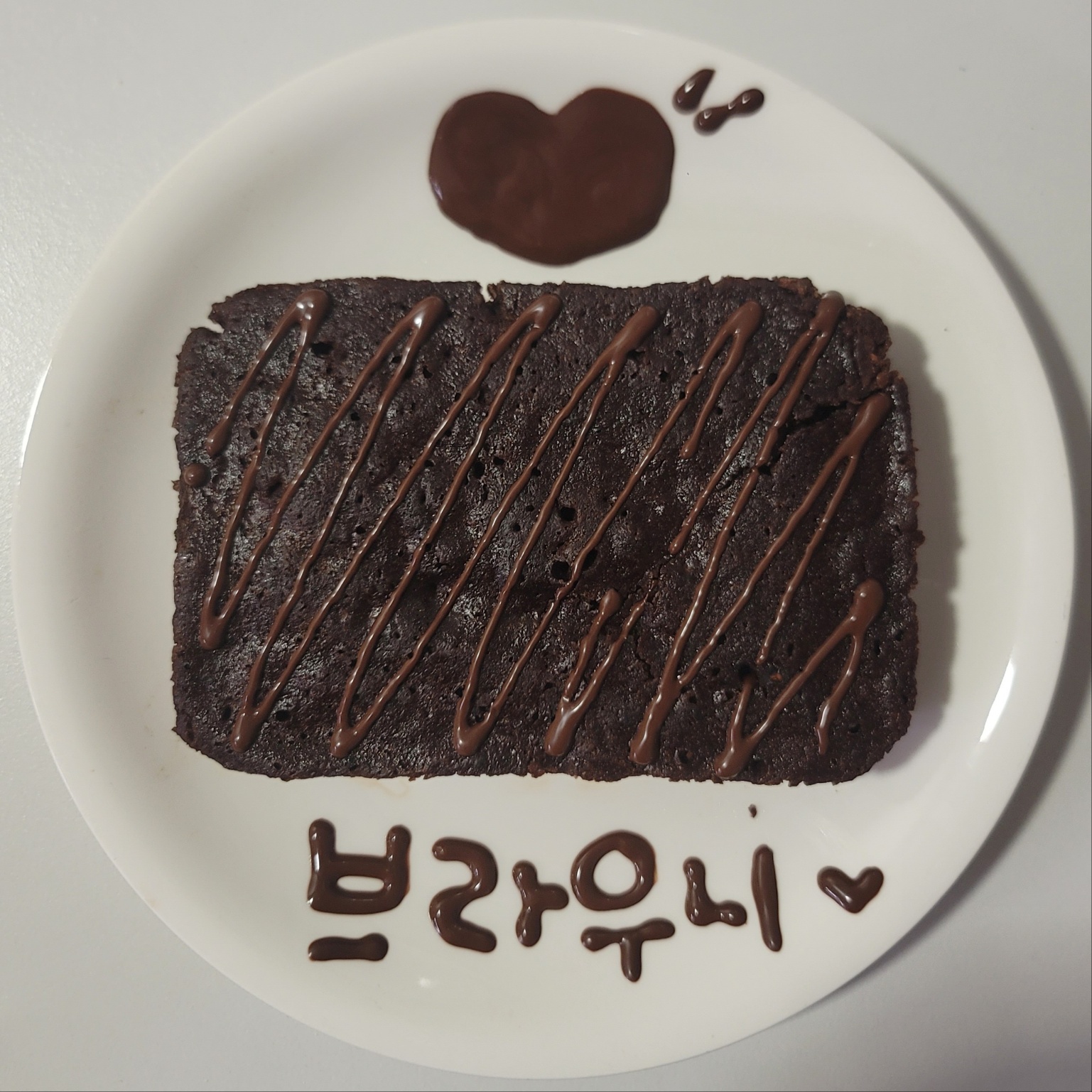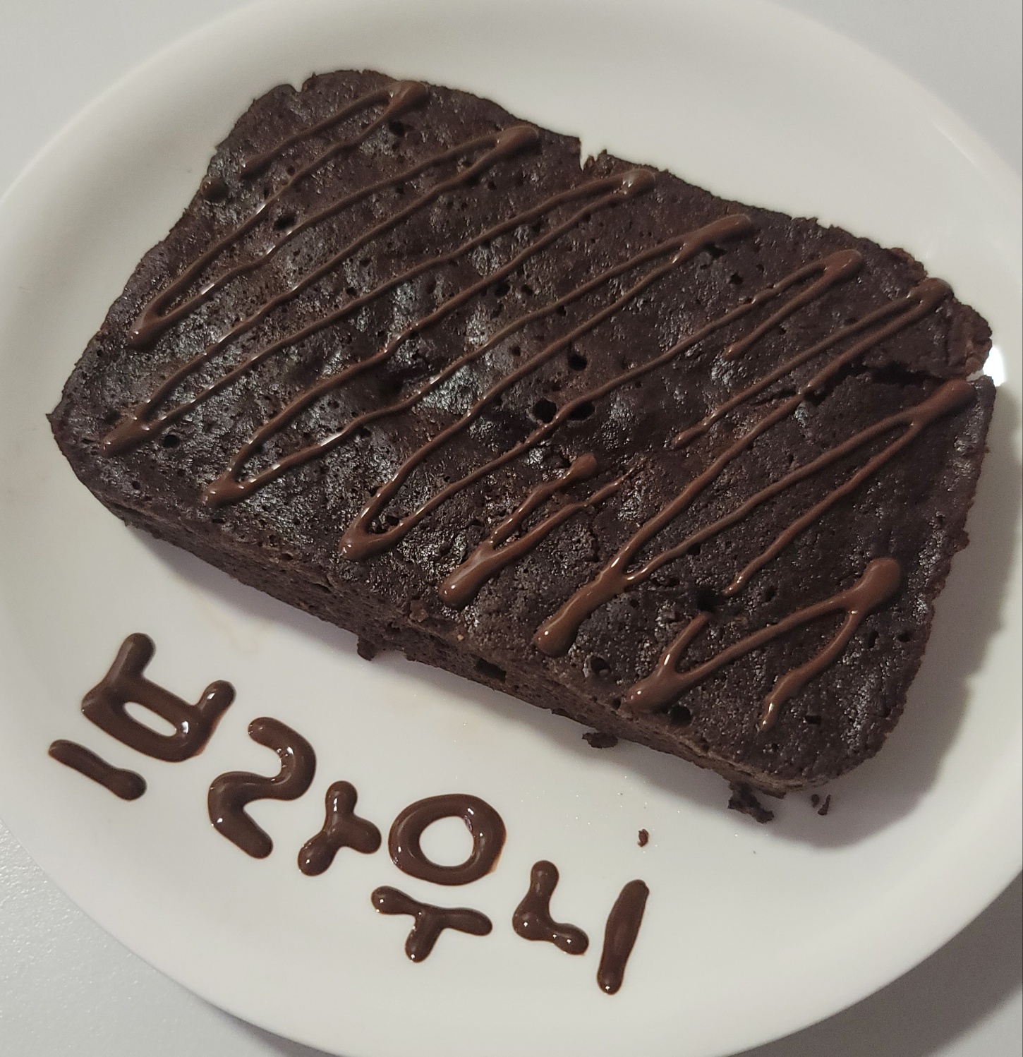 짠~~~~! 초코바나나브라우니가 완성이 되었습니다. 용기에 바른 올리브유 덕분에 브라우니가 예쁘게 분리가 되네요. 브라우니가 행성 표면 같은 비주얼이라 맛있어 보이지 않아 제로 초코시럽을 이용해서 꾸며줍니다.