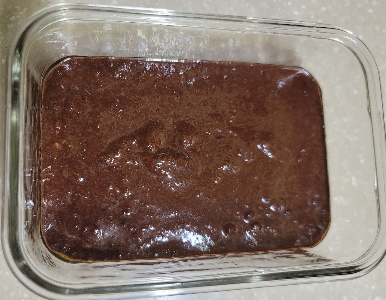 용기에 잘 섞인 반죽을 부어줍니다. 다 붓고 용기를 들고 밑으로 탁 치면 반죽이 평평해져요.