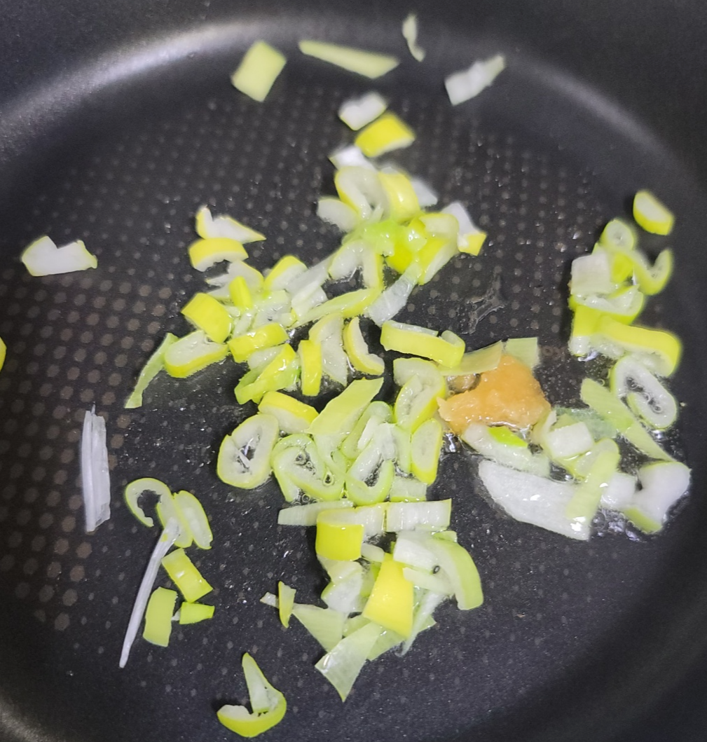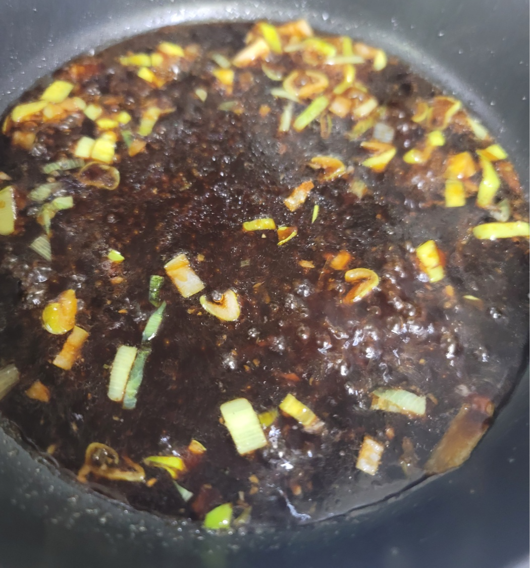 다진 대파와 다진마늘 1/2T를 기름에 볶아줍니다. 마늘과 파 향이 올라오면 설탕 2T, 간장 1T, 식초 1T, 미림 1T, 굴소스 1/2T, 물 3T를 넣고 보글보글 끓여줍니다.