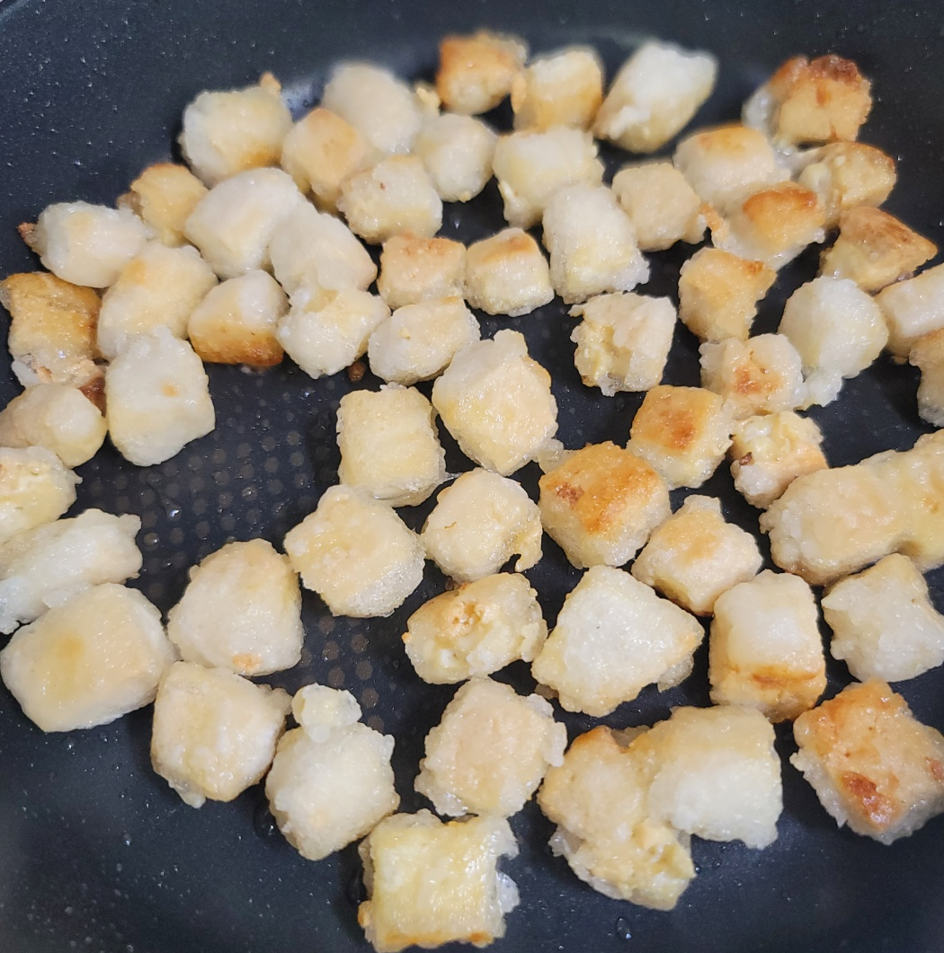 노릇노릇하게 익어갑니다. 각 면들을 굴려가며 구워주세요. 전분 때문에 두부끼리 들러붙는 곳도 있는데 그냥 떼어내 주시면 됩니다.