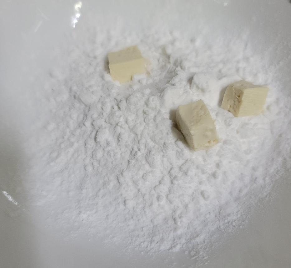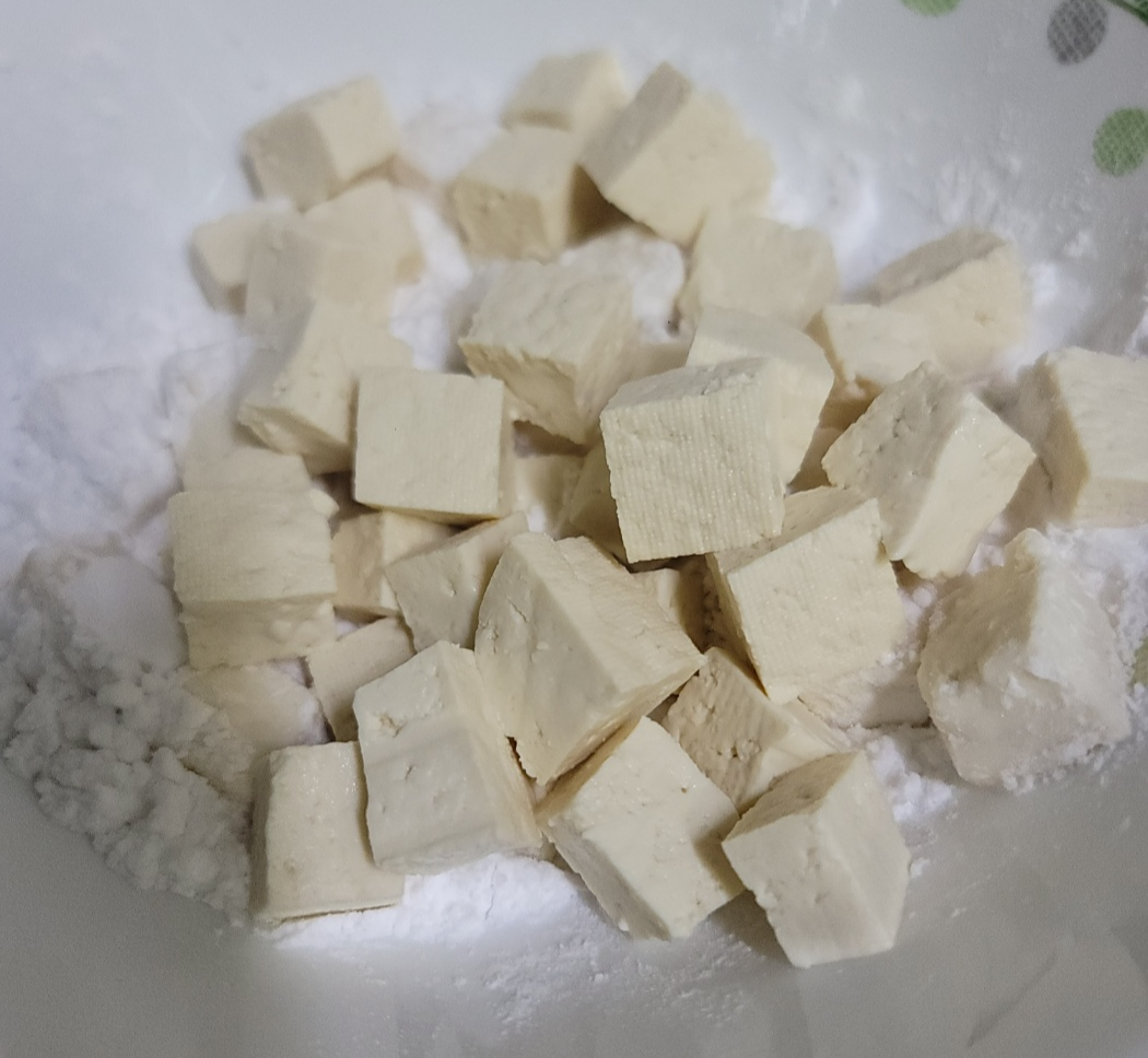 전분가루 3T를 넣고 그 위에 두부를 넣어줍니다. 두부에 전분가루를 골고루 입혀줍니다. 전분가루가 골고루 묻었네요. 너무 세게 섞으면 두부가 부서지니 조심조심 굴려주듯이 입혀주세요.