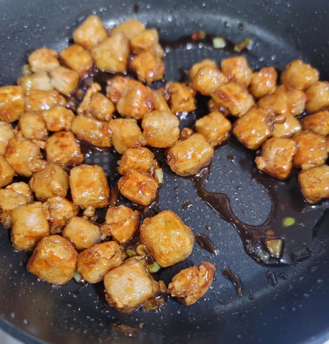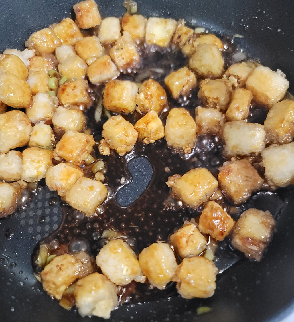 소스가 끓으면 튀겨둔 두부를 소스에 넣어줍니다. 골고루 소스가 묻히도록 섞어줍니다. 맛있어져라~