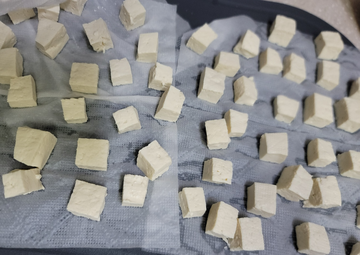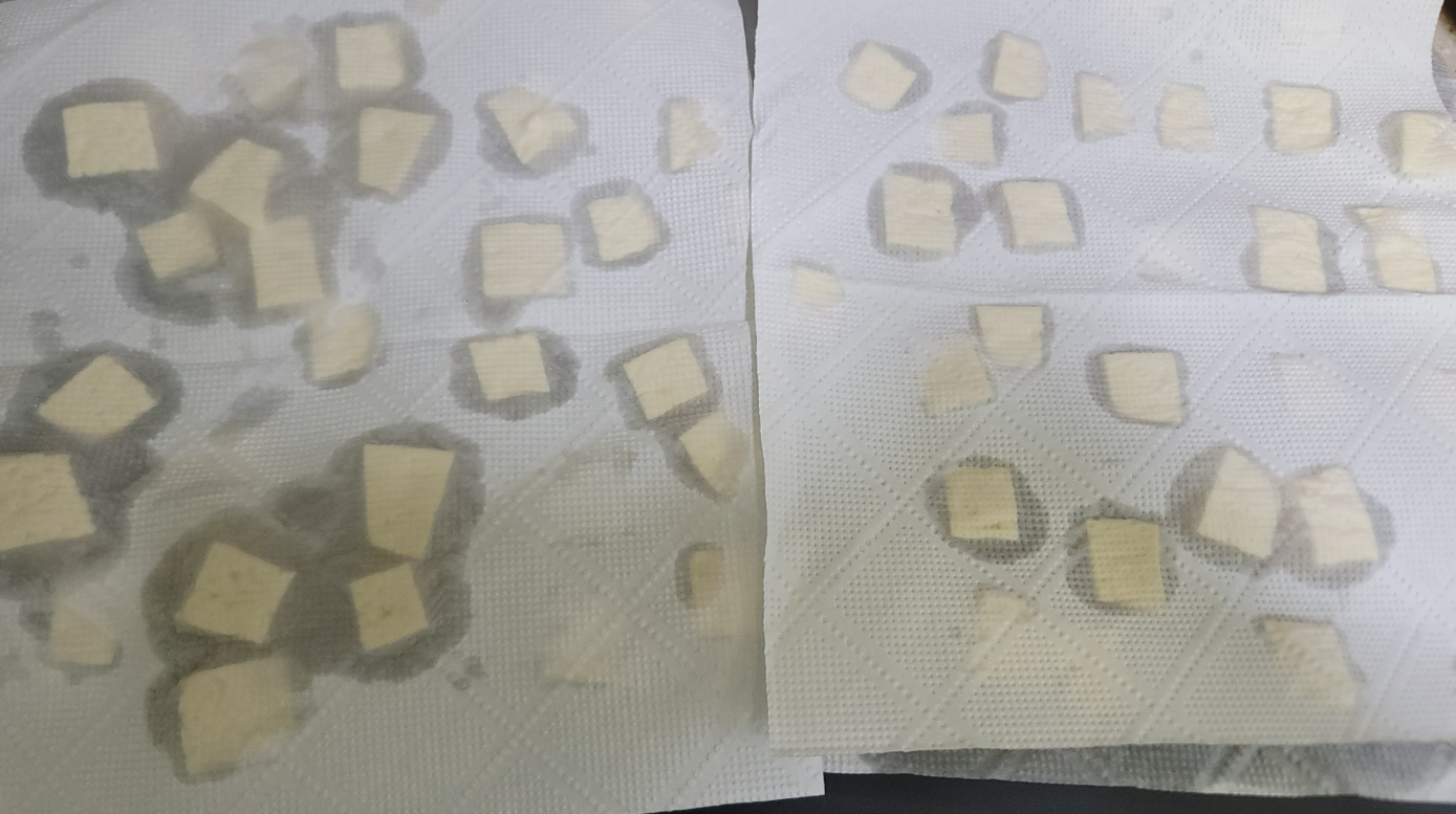 두부의 물기를 최대한 닦아낸 후 먹기 좋은 크기로 썰어줍니다. 어른이 먹으려면 크게 아이가 먹으려면 조금 작게 썰면 좋아요.