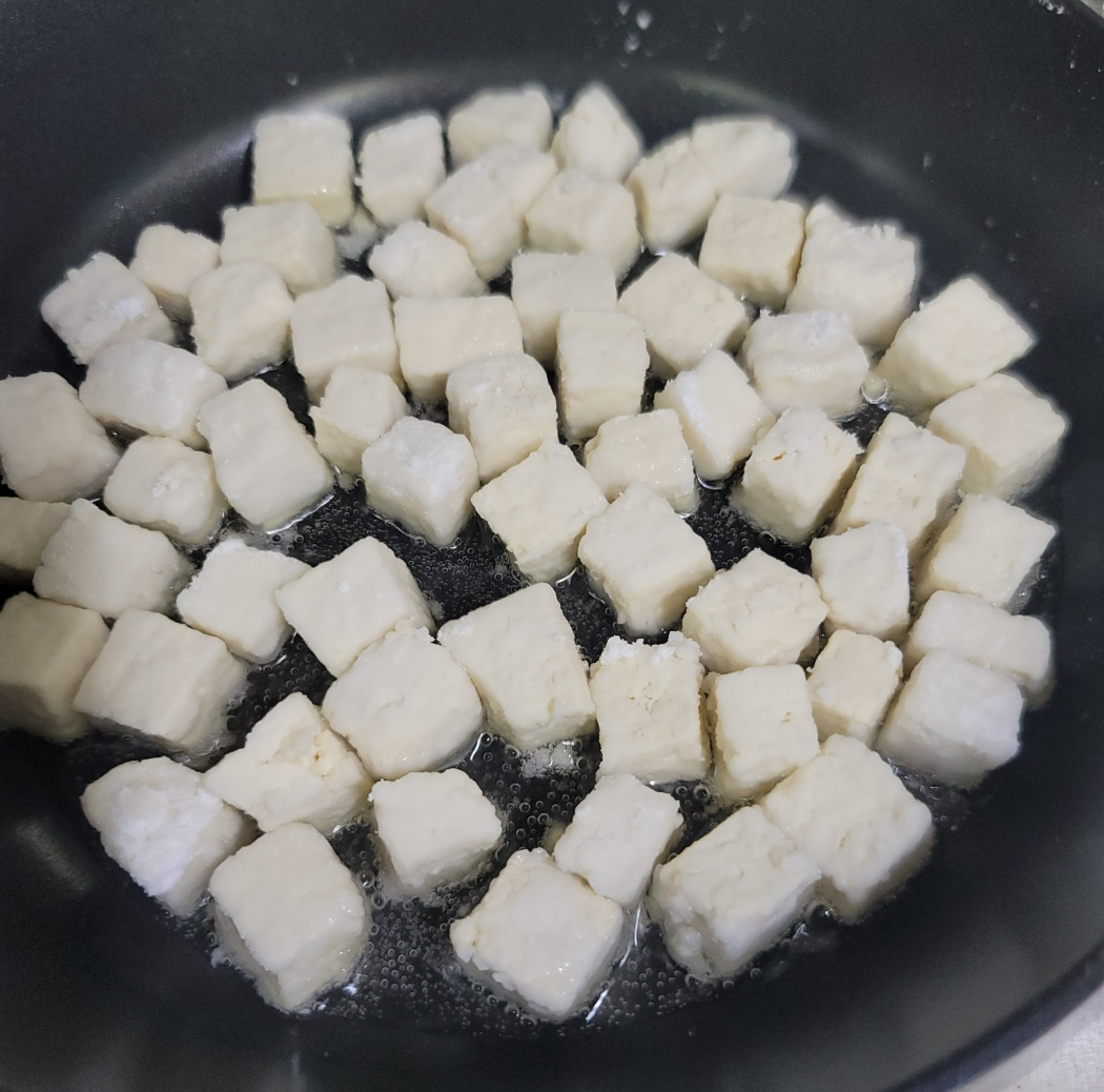 기름이랑 두부를 같이 올려 중불로 켜줍니다. 끓는 기름에 두부를 넣게 되면 수분 때문에 튈 수 있으니 같이 올려주세요.