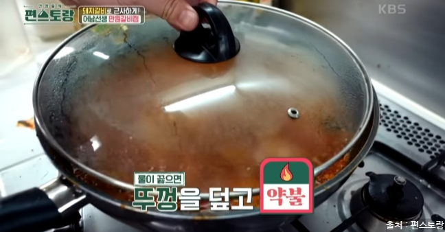 물이 끓으면 뚜껑을 덮고 약불로 40분간 뭉근하게 졸여주세요. 돼지갈비가 부드러워집니다.