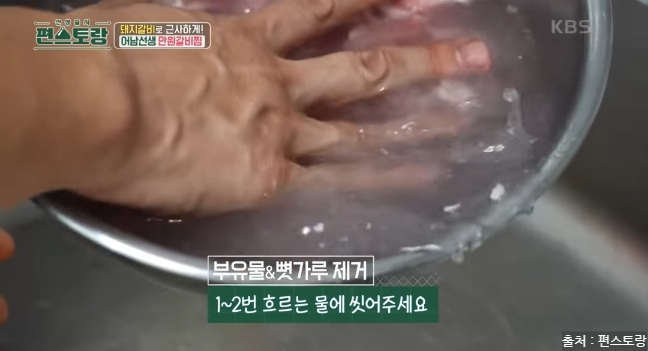돼지갈비는 지방이 많은 걸로 준비해 주세요. 먹기 좋게 자르고 흐르는 물에 1~2번 씻어주세요. 부유물과 뼛가루가 제거됩니다. 신선한 돼지갈비는 핏물을 뺄 필요 없이 바로 조리를 시작하면 됩니다.