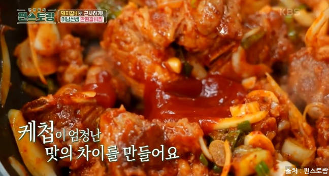 이때 매운 갈비찜의 포인트! 케첩 2T를 넣어주세요. 케첩이 엄청난 맛의 차이를 만들어줍니다. 케찹을 넣으면 강불로 열심히 뒤적여 주세요. 고춧가루와 케찹이 섞여 깔끔한 맛의 고추장소스처럼 변신합니다.