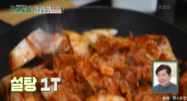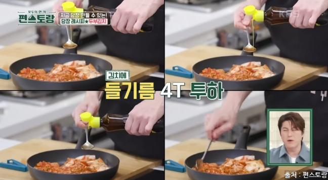 김치는 들기름에 볶는 게 가장 맛있다고 하네요. 김치에 들기름 4T를 넣어주고 달달함을 위해 설탕 1T를 넣고 짭짤함을 위해 간장 1T를 넣어줍니다.