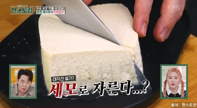 두부를 대각선으로 세모 모양으로 잘라줍니다. 자른 두부를 세워 사선으로 썰어줍니다. 두부는 먹기 좋게 편하신 대로 썰어도 좋아요.